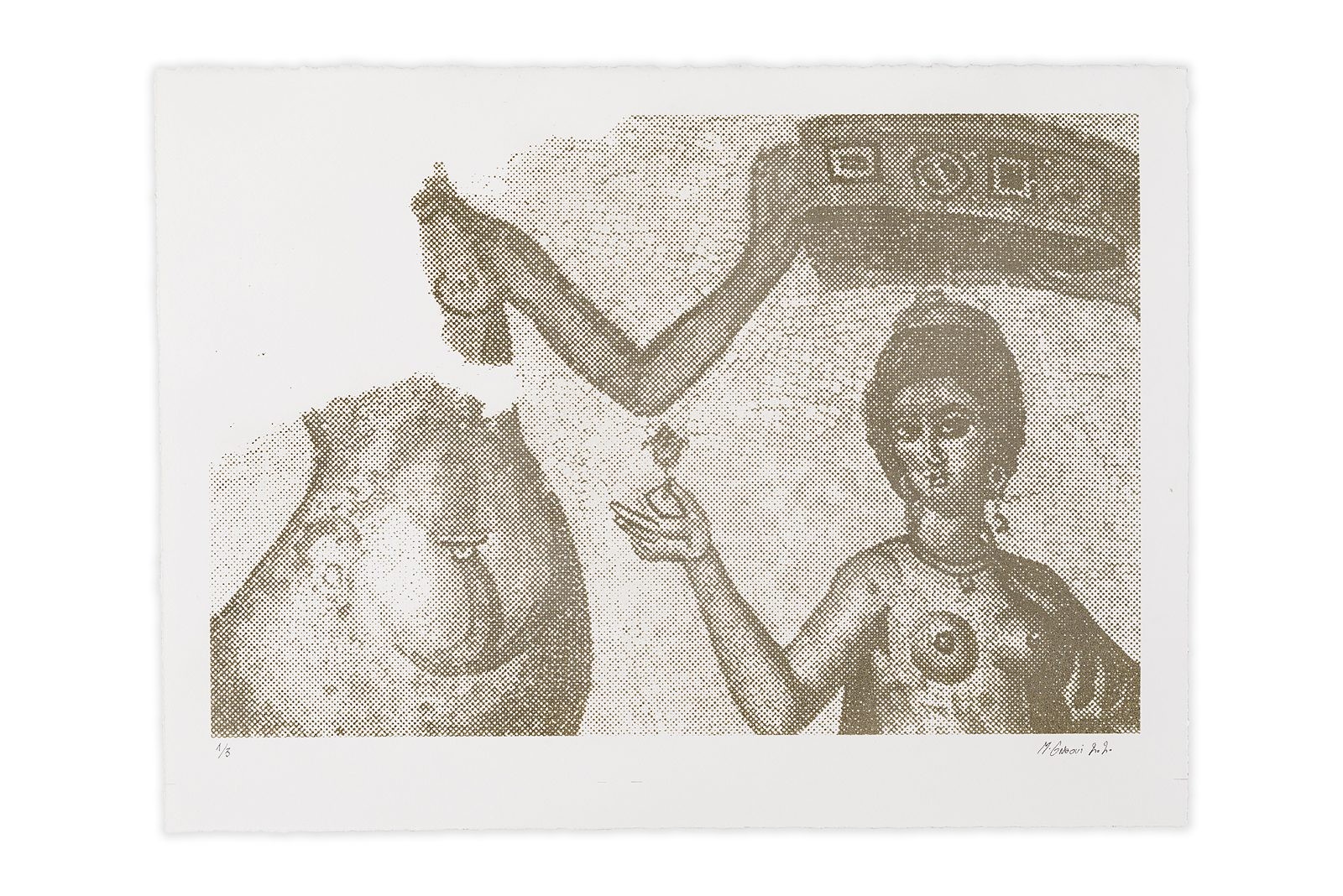 <figcaption> Malek Gnaoui, SC20/hidden time 02, 2020. Screen-print and walls dust on paper, 57h x 77w cm. From Essaïda-Carthage series. Courtesy of Selma Feriani Gallery and the artist. Photo © Pol Guillard