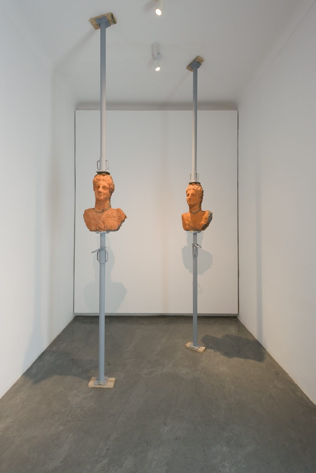 <figcaption> Malek Gnaoui, SC20/between two (Diptych), 2020. Bricks, cement and iron construction props, 374h 46w x 24,5d cm & 374h 40,5w x 24,5d cm. From Essaïda-Carthage series. Courtesy of Selma Feriani Gallery and the artist. Photo © Pol Guillard