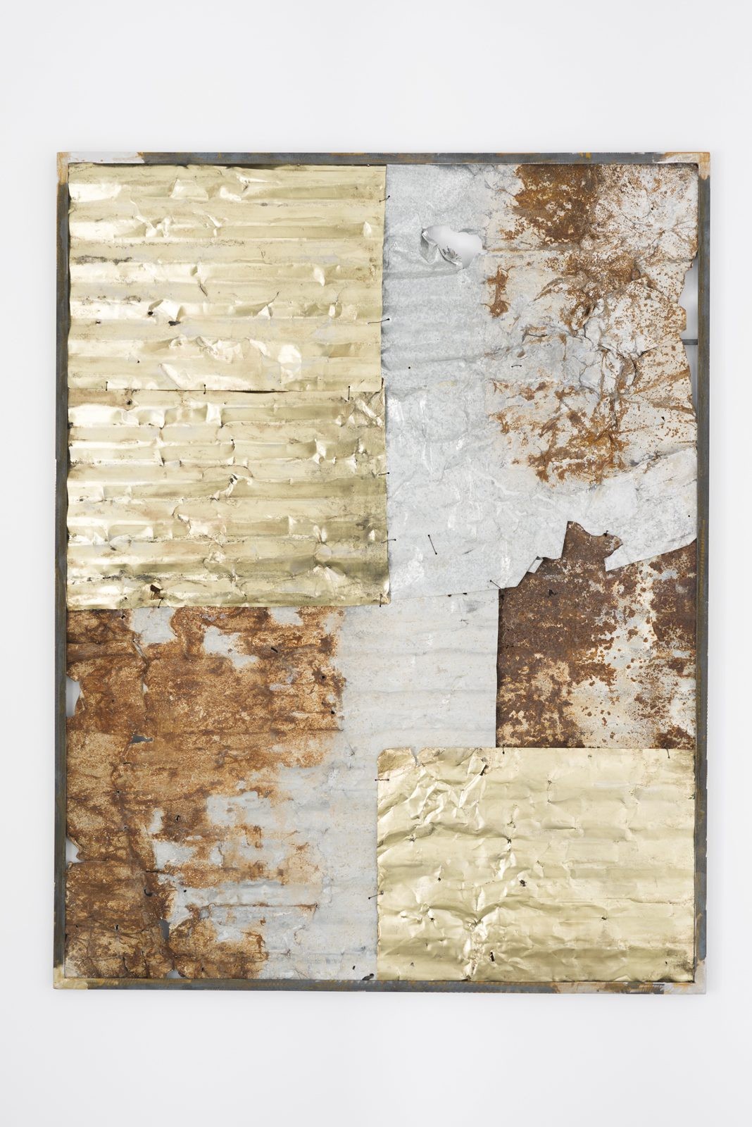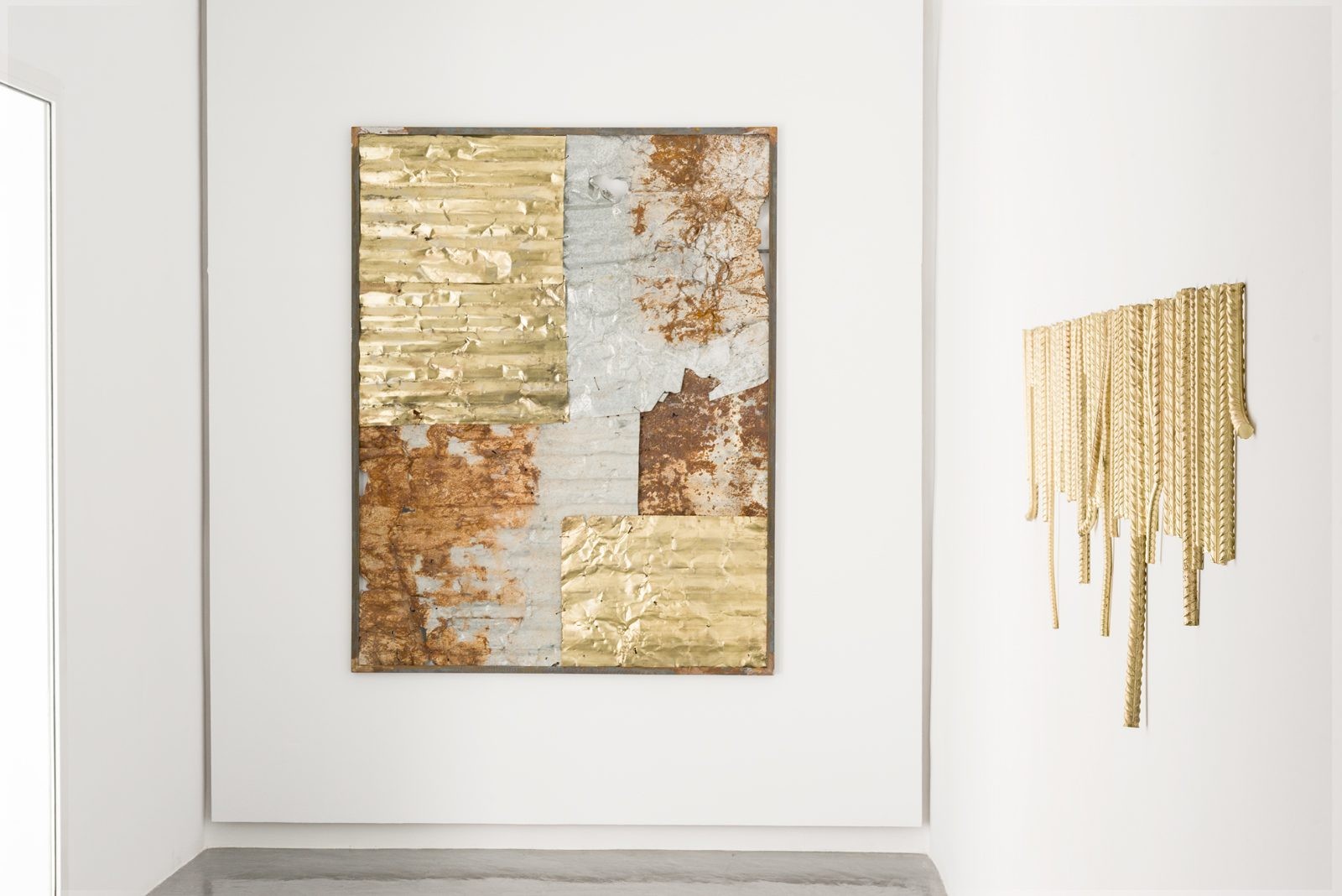 <figcaption> Malek Gnaoui, SC20/Ro 01, 2020. Corrugated iron sheets, dismantled from homes and brass-plated, 180h x 140w cm. From Essaïda-Carthage series. Courtesy of Selma Feriani Gallery and the artist. Photo © Pol Guillard