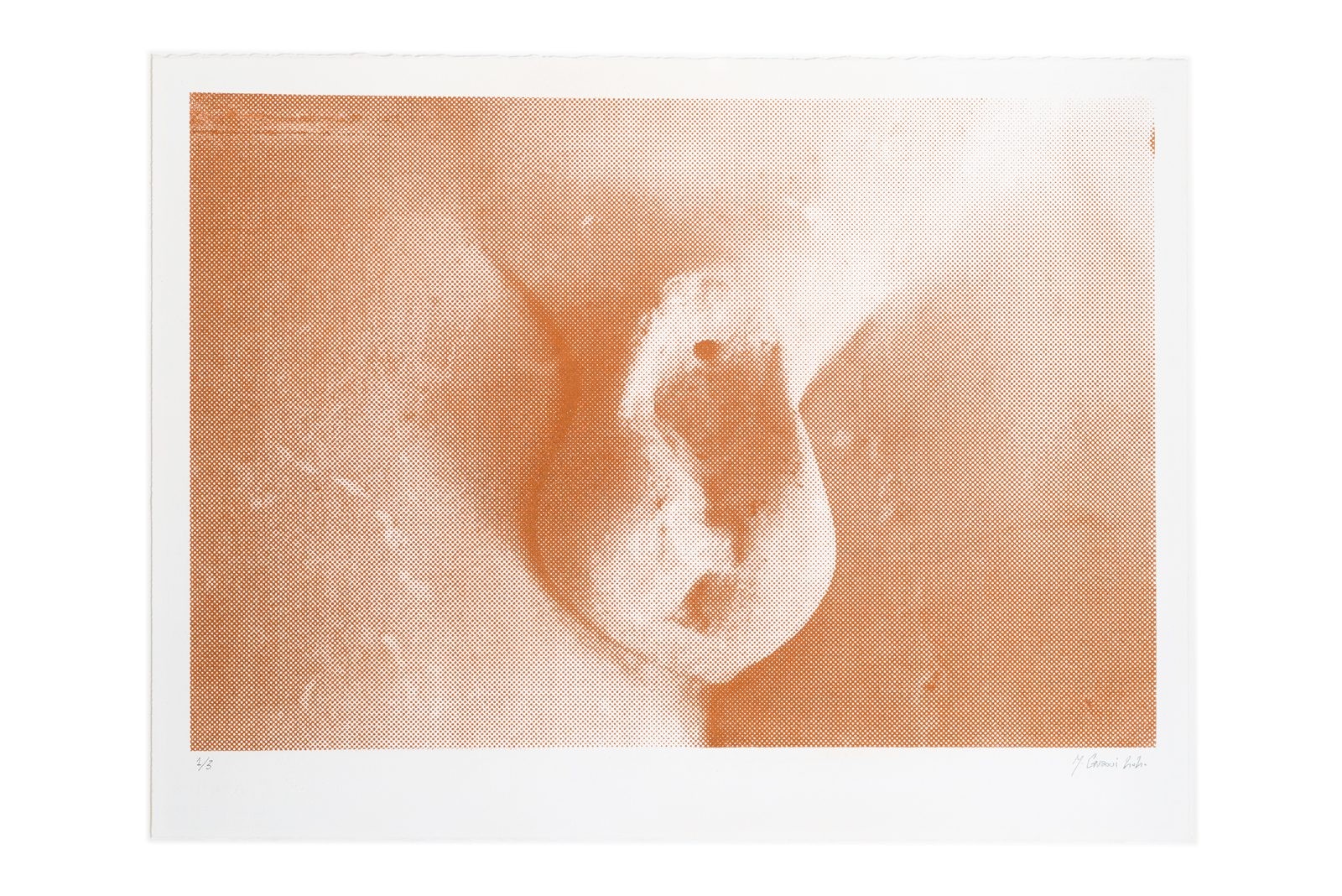 <figcaption> Malek Gnaoui, SC20/broken 02, 2020. Screen-print and red brick dust on paper, 57h x 77w cm. From Essaïda-Carthage series. Courtesy of Selma Feriani Gallery and the artist. Photo © Pol Guillard