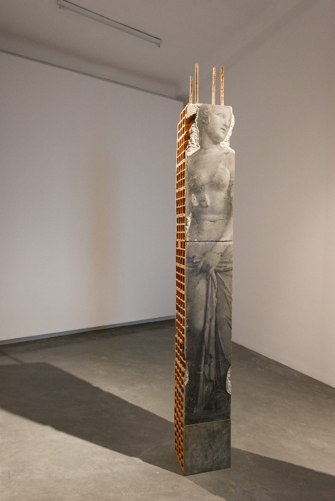<figcaption> Malek Gnaoui, SC20/P.B 01, 2020. Bricks, cement, round bars and printing on concrete, 236,5h x 27,5w x 22d cm. From Essaïda-Carthage series. Courtesy of Selma Feriani Gallery and the artist. Photo © Pol Guillard