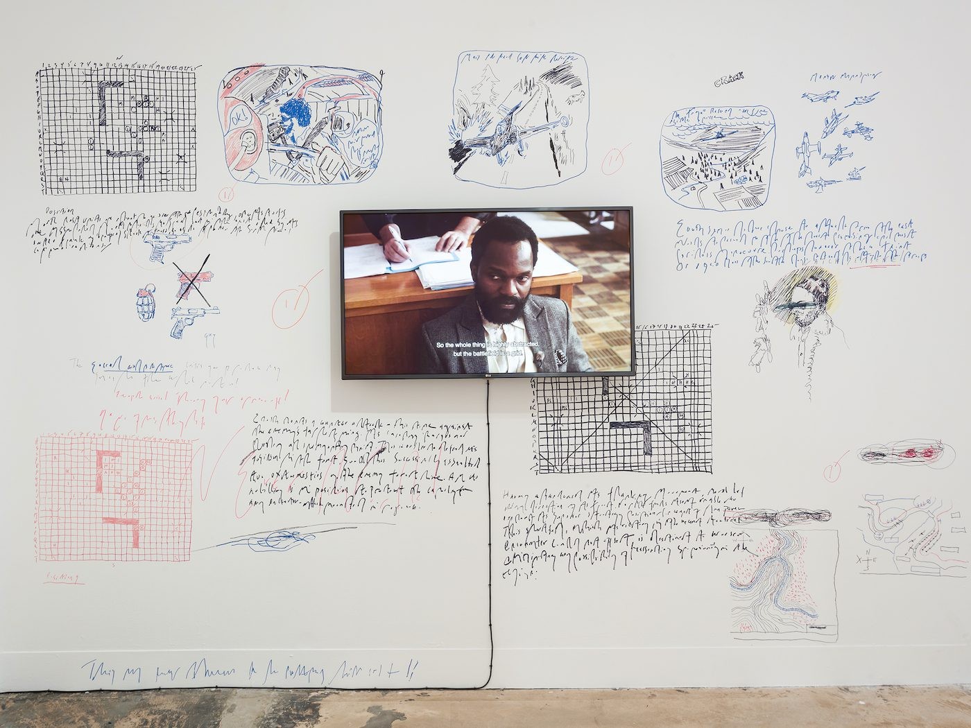 <figcaption> Samson Kambalu, A Game of War: Kambalu v Sanguinetti Trial at Ostend, 2021, installation vidéo, 2h10, vue de l’installation au Modern Art Oxford, 2021. Courtesy galerie Kate MacGarry. Photo : Mark Blower