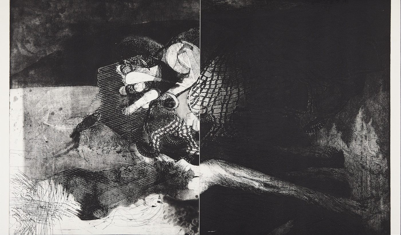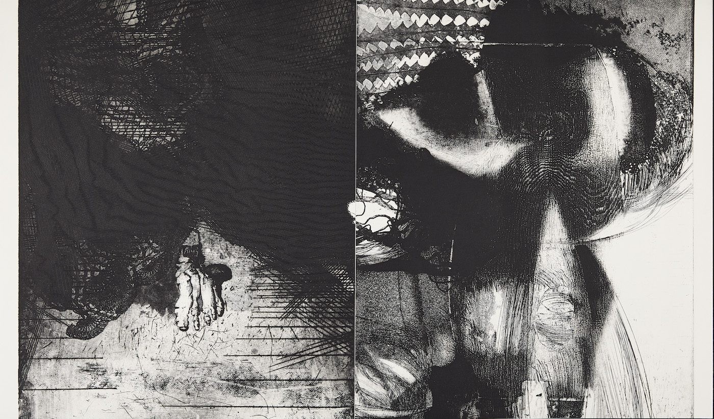 Dirge (1986) Mohammad Omar Khalil. Etching / sugarlift / spitbite / aquatint, 100cm x 75.5cm