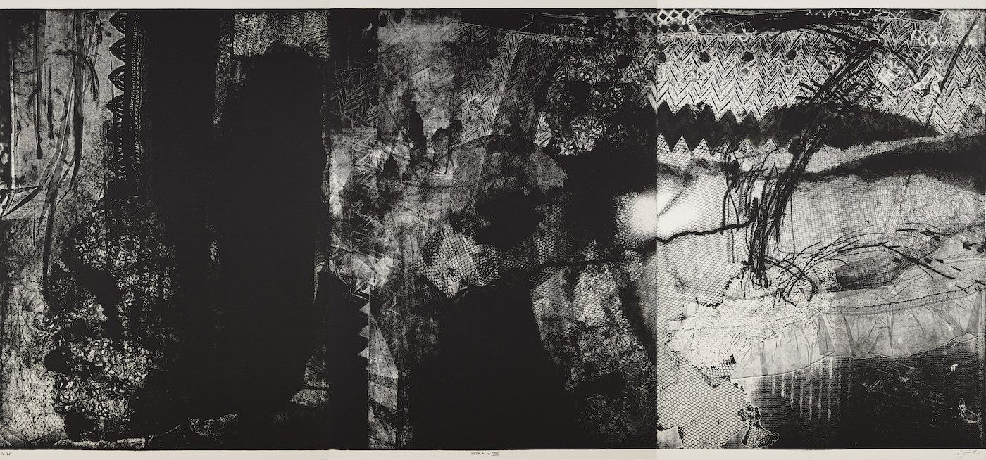 Mohammad Omar Khalil, Petra VIII, 1997. Photo: Andy Stagg, courtesy The Mosaic Rooms. Soft ground / aquatint / spitbite / drypoint, 101cm x 228cm