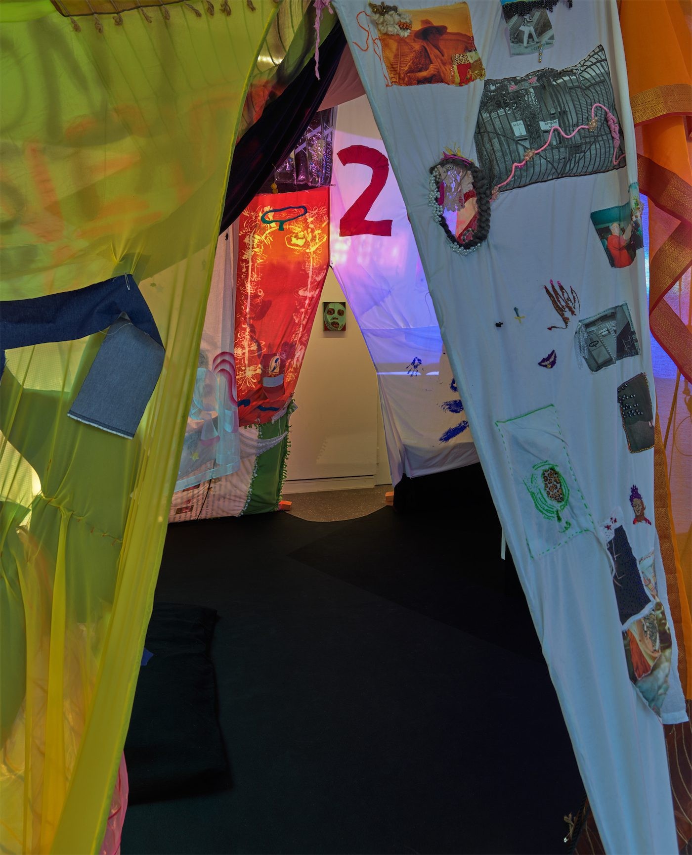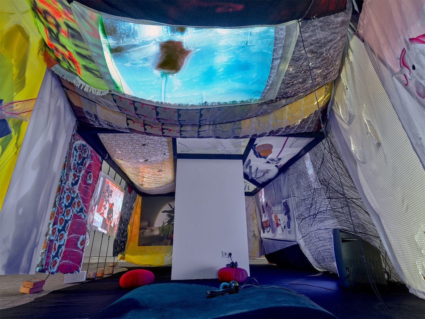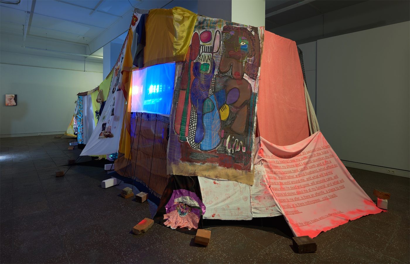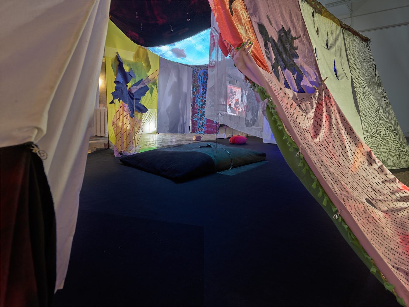 In Hands Full of Air, Monilola Olayemi Ilupeju explores intuition and vulnerability as a starting point for a practice of collective care. Influenced by the ephemeral nature of blanket forts, the immersive installation comprises altered bedsheets and textiles contributed by her friends and artists from around the world. Each piece embodies an affective moment, a trace of intimacy, or a gesture of love. Into this collaborative support structure, Ilupeju weaves her own videos, paintings, fabrics and objects, in which she examines the formation of the self within constructed epistemologies of sexuality, history, and representation. Curated by Jorinde Splettstößer and with fabric contributions by: Sharmeen Anjum, Peter Basma-Lord, Anguezomo Mba Bikoro, Lu Rose Biltucci, Ellie Lizbeth Brown, Federica Bueti, Lucia Pedroso Cabrera, Olivia Chou with Ally Zhao, Binta Diaw, Nathan Storey Freeman, Bambi Glass, Danny Greenberg, Riya Hamid, Nile Harris, Samhita Kamisetty, Avantika Khanna, Byron Kim, Eleanor Kipping, Beverly „KöTA WALi“, Kelly Krugman, Cooper Lovano, Markues, Adam Milner, Emily Velez Nelms, Luiza Prado, Thomias Radin, Elliot Reed, Djibril Sall, Lorenzo Sandoval, Lili Somogyi, among others. Go on a 3D Tourhere.