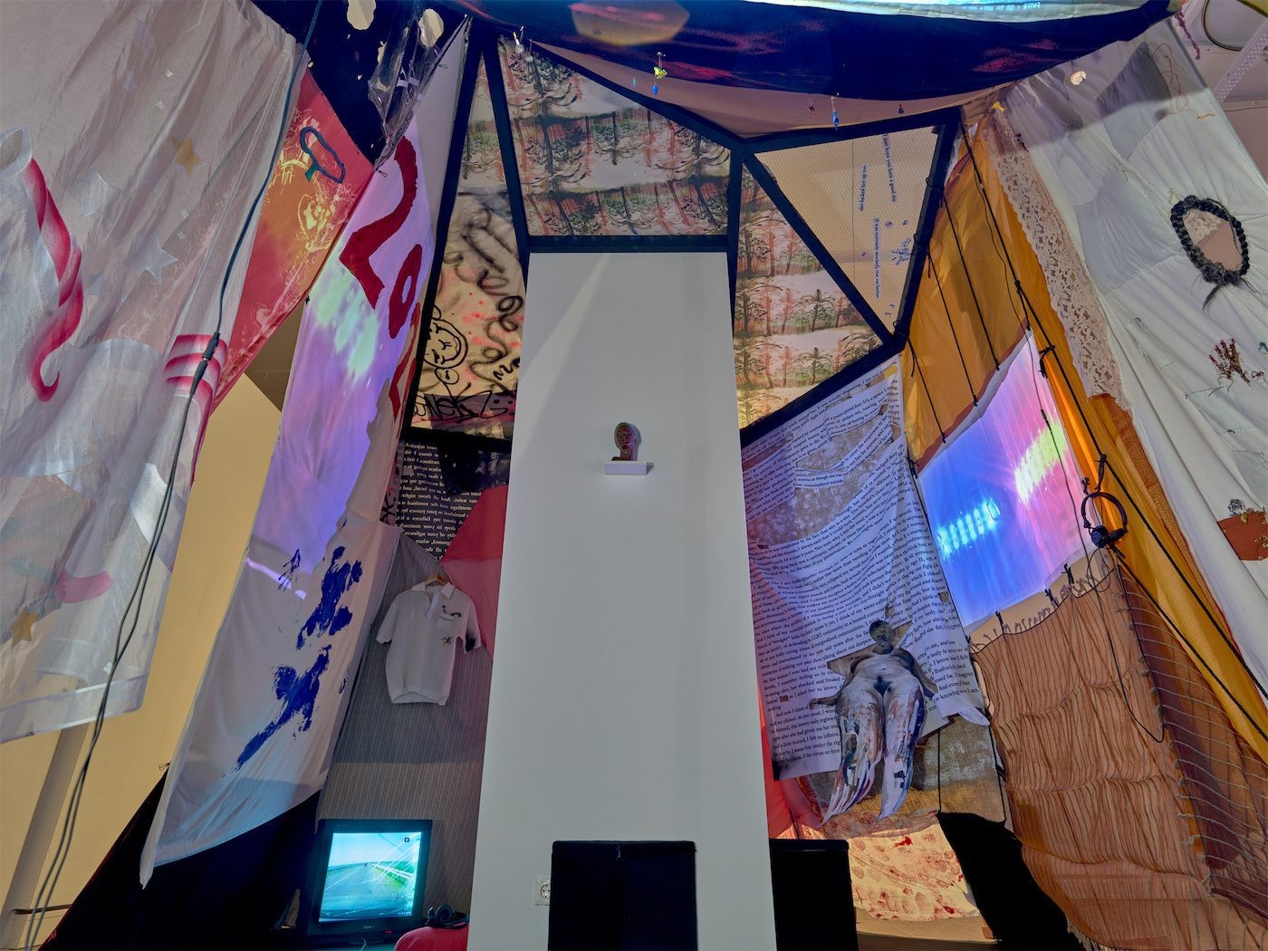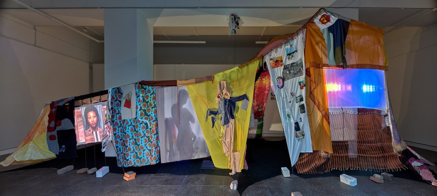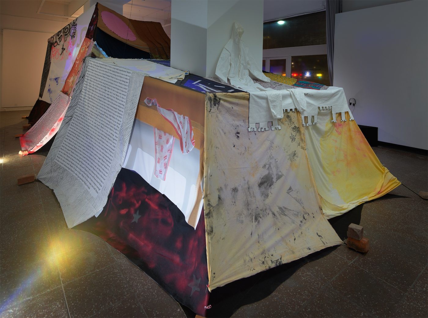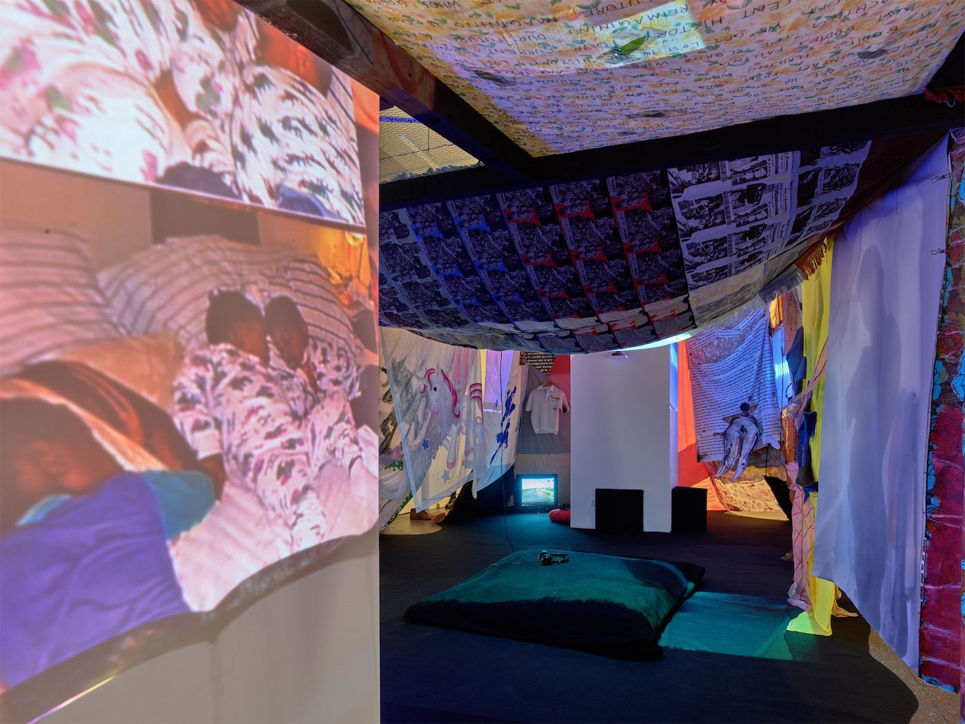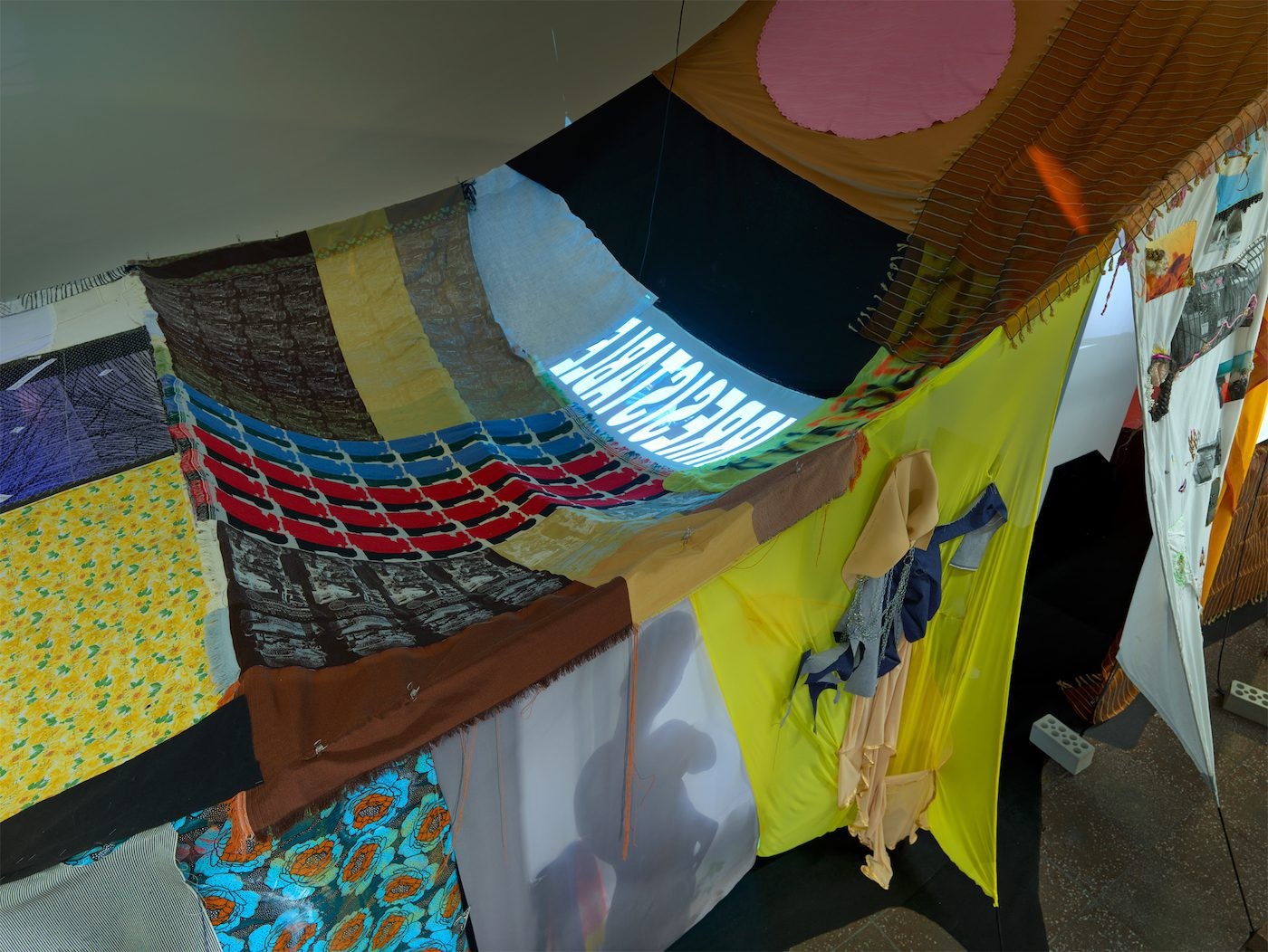 In Hands Full of Air, Monilola Olayemi Ilupeju explores intuition and vulnerability as a starting point for a practice of collective care. Influenced by the ephemeral nature of blanket forts, the immersive installation comprises altered bedsheets and textiles contributed by her friends and artists from around the world. Each piece embodies an affective moment, a trace of intimacy, or a gesture of love. Into this collaborative support structure, Ilupeju weaves her own videos, paintings, fabrics and objects, in which she examines the formation of the self within constructed epistemologies of sexuality, history, and representation. Curated by Jorinde Splettstößer and with fabric contributions by: Sharmeen Anjum, Peter Basma-Lord, Anguezomo Mba Bikoro, Lu Rose Biltucci, Ellie Lizbeth Brown, Federica Bueti, Lucia Pedroso Cabrera, Olivia Chou with Ally Zhao, Binta Diaw, Nathan Storey Freeman, Bambi Glass, Danny Greenberg, Riya Hamid, Nile Harris, Samhita Kamisetty, Avantika Khanna, Byron Kim, Eleanor Kipping, Beverly „KöTA WALi“, Kelly Krugman, Cooper Lovano, Markues, Adam Milner, Emily Velez Nelms, Luiza Prado, Thomias Radin, Elliot Reed, Djibril Sall, Lorenzo Sandoval, Lili Somogyi, among others. Go on a 3D Tourhere.