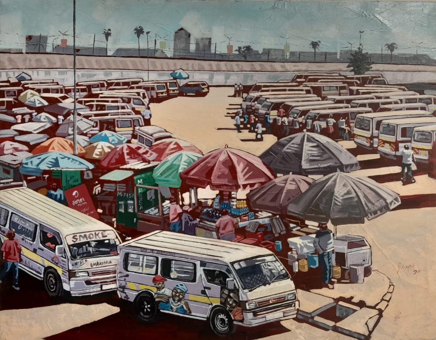 One artist who impressed in particular was Brian Kimani, the main exhibitor in this group show, whose painting Main Stage 1 is featured on the cover poster. Kimani’s ability to intricately capture the shadows and contours of the busses and various subjects at matatu terminals in the heat of Nairobi’s equatorial sun, and yet still maintain a realist subtlety is impressive, especially as this is not an easy feat in acrylics.