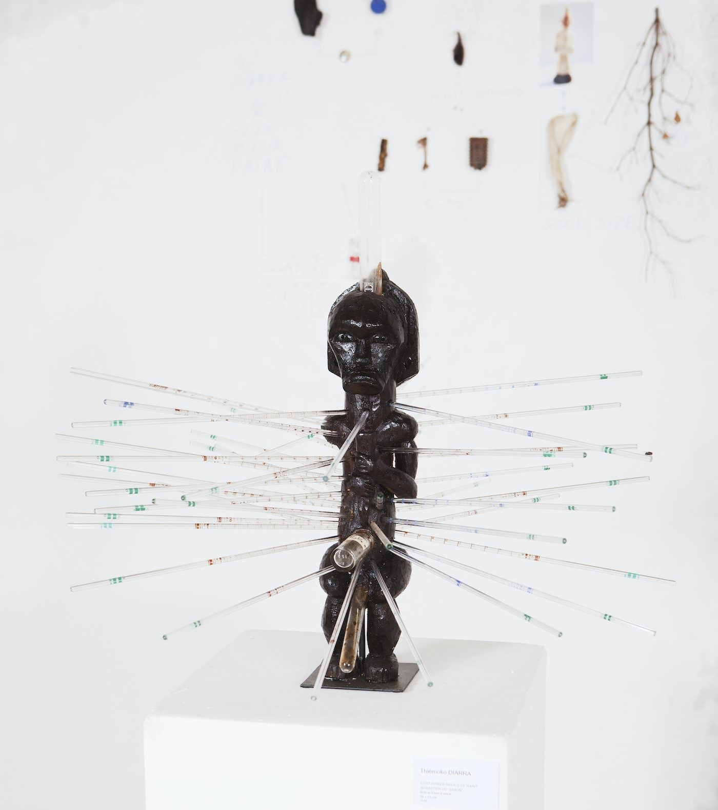 <figcaption> Thiemoko Diarra, LOST POWER RELICS 03 “SAINT SEBASTIEN DU GABON”, 2019. Installation View Biennale Internationale de Sculpture de Ouagadougou 2019.