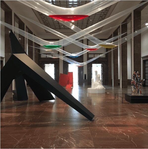 Upon arriving at HDK, the doubt and a certain skepticism that I still felt about the project, were mixed with the strange sensation of visiting for the first time. The neo-classical building definitely does not resemble anything else around. All that physical structure and the still-visible Nazi remnants make it impossible not to reflect on its difficult past. Its magnitude functions as a space of reflection that certainly guided my gaze in the two days I visited “Postwar”. This same magnitude offers an interesting space for the installation “Work (Water)” 1956, the emblematic work by Sadamasa Motonaga, produced with vinyl sheets filled with dyed water and presented for the first time in a park in Japan between nets and trees; or even when you look at Atsuko Tanaka’s wearable sculpture “Electric dress”.