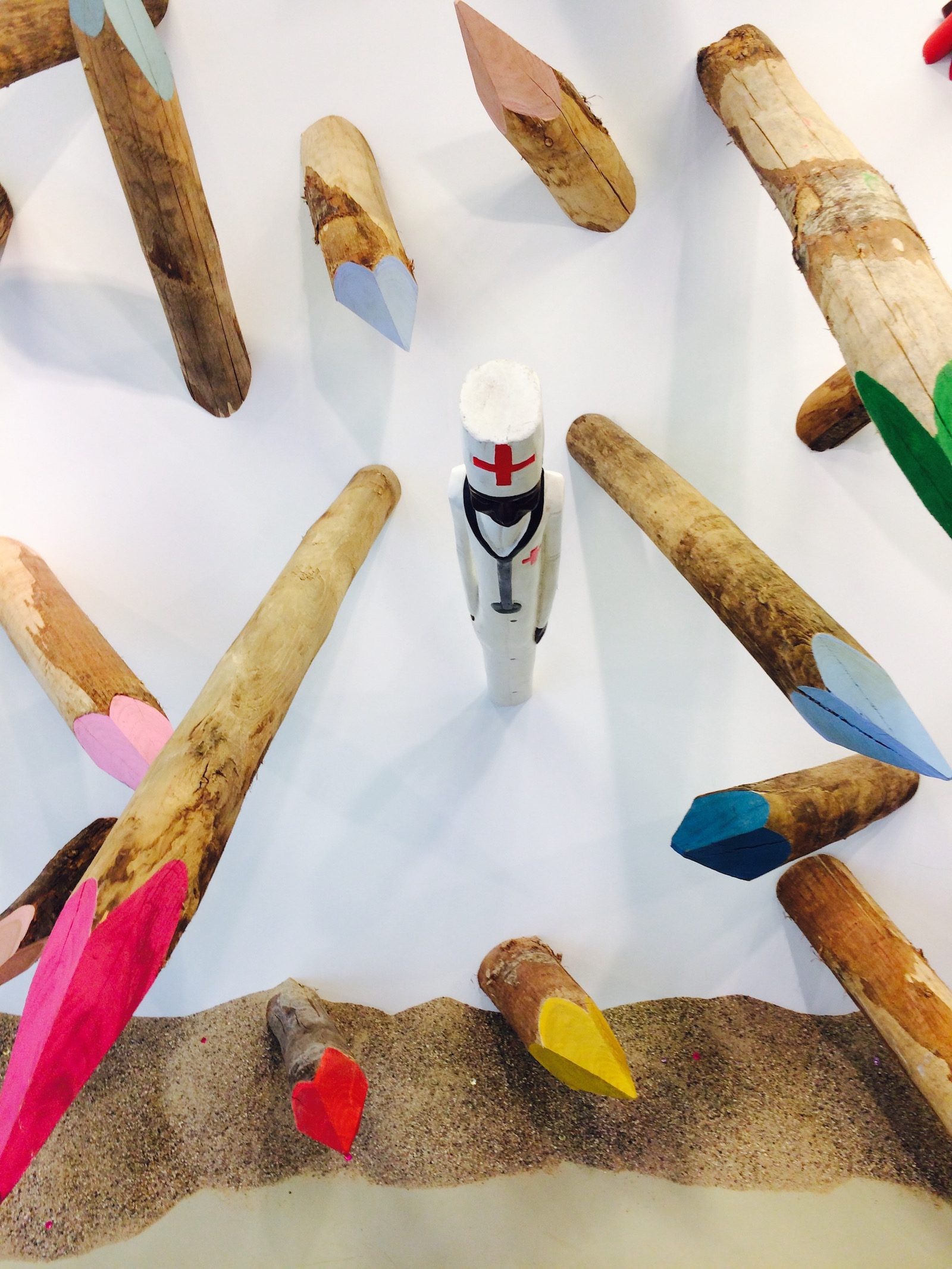 To sketch a summary of the history of Kolmanskop, Tayou has carved thorny colored pencils for us. They are mounted on a long section of wall in the space, setting the tone for the hostilities. Wooden figurines interspersed between the pencils signify the importance of re-routing specific cultural representations initiated by those who have long argued that their power is utterly rational, based on diminishing the identity of an Other and on the historical destruction of cultures.
