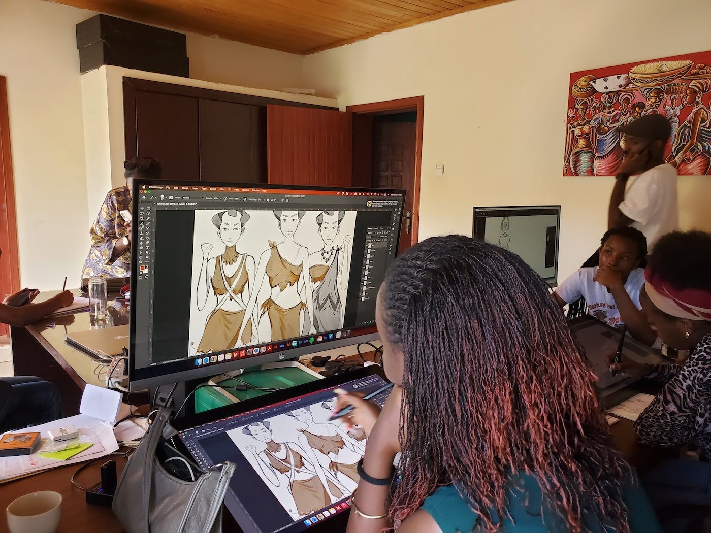 A scorchingly sunny afternoon finds me at InkStain, an illustration, animation, and video agency in Kacyiru, Kigali, where I meet Kakizi for our interview. It is a normal day for Kakizi, who is in the midst of facilitating training sessions for six young women. Titled Murika (to show a path) and inspired by the desire to uplift young women through skills, the six-month mentorship project opens up participants to creating an online presence, biography writing, digital sketching, and painting (among other skills) in the spirit of professionalizing their practice.