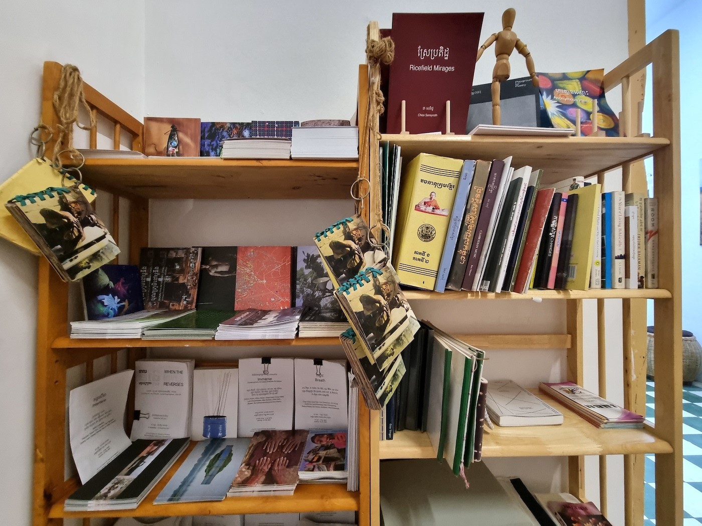 The library includes 200 books and has been built up over time from donations, purchases and self-publishing initiatives. Just like the artists' collective which inscribes its practice in the construction of collective knowledge, the library focuses on the Cambodian social fabric while being connected to the artistic ecosystems of the South East region. Lying on the shelves is a significant collection of contemporary art magazines and books from China, Japan, Taiwan, Indonesia, Thailand and Vietnam. Also accessible in the reading room is a rare archive of photo materials about the neighbourhood's bold community of artists and events from 2000 till today, but also architecture books, micro-editions and rare research in Cambodian about the development of contemporary arts in Cambodia. The reading room also welcomes projects based reading or listening sessions with scholars allowing dynamic didactic transposition of academic contents relating to archives to broader audiences.