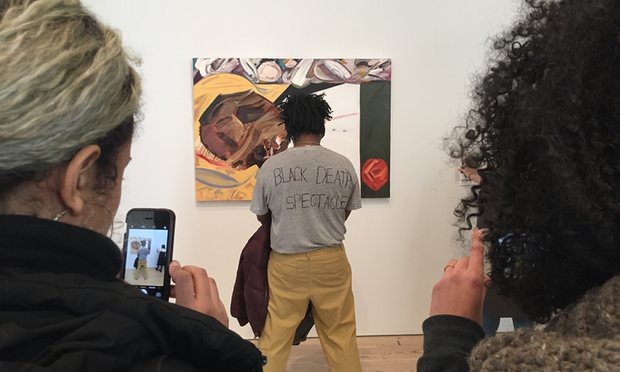 <figcaption> “Many in the black art community are upset by the work” ... Parker Bright protesting Emmett Till painting at the Whitney in New York. Photograph: Twitter (provider has asked not to be identified). Source: The Guardian