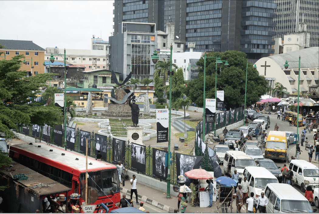 The venue for the exhibition is a well-known public space in Lagos: Tinubu Square, which is oval-shaped and not a square like its name suggests. Seventy-four large-format photographs are printed on tarpaulin and displayed on the square’s high iron railings, making the space look like a life-sized film sequence. The busy surroundings make it an ideal place to catch people’s attention, stun them with history, engage them in new information, and show them beautiful imagery.