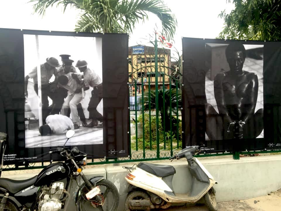 <figcaption> Installation View of 50 years of Things Fall Apart (1971) – »Film Stills by Stephen Goldblatt« from 24 Jul 2021 - 04 Sep 2021 at Tinubu Square, Lagos. Photo: Ebunoluwa Akinbo.