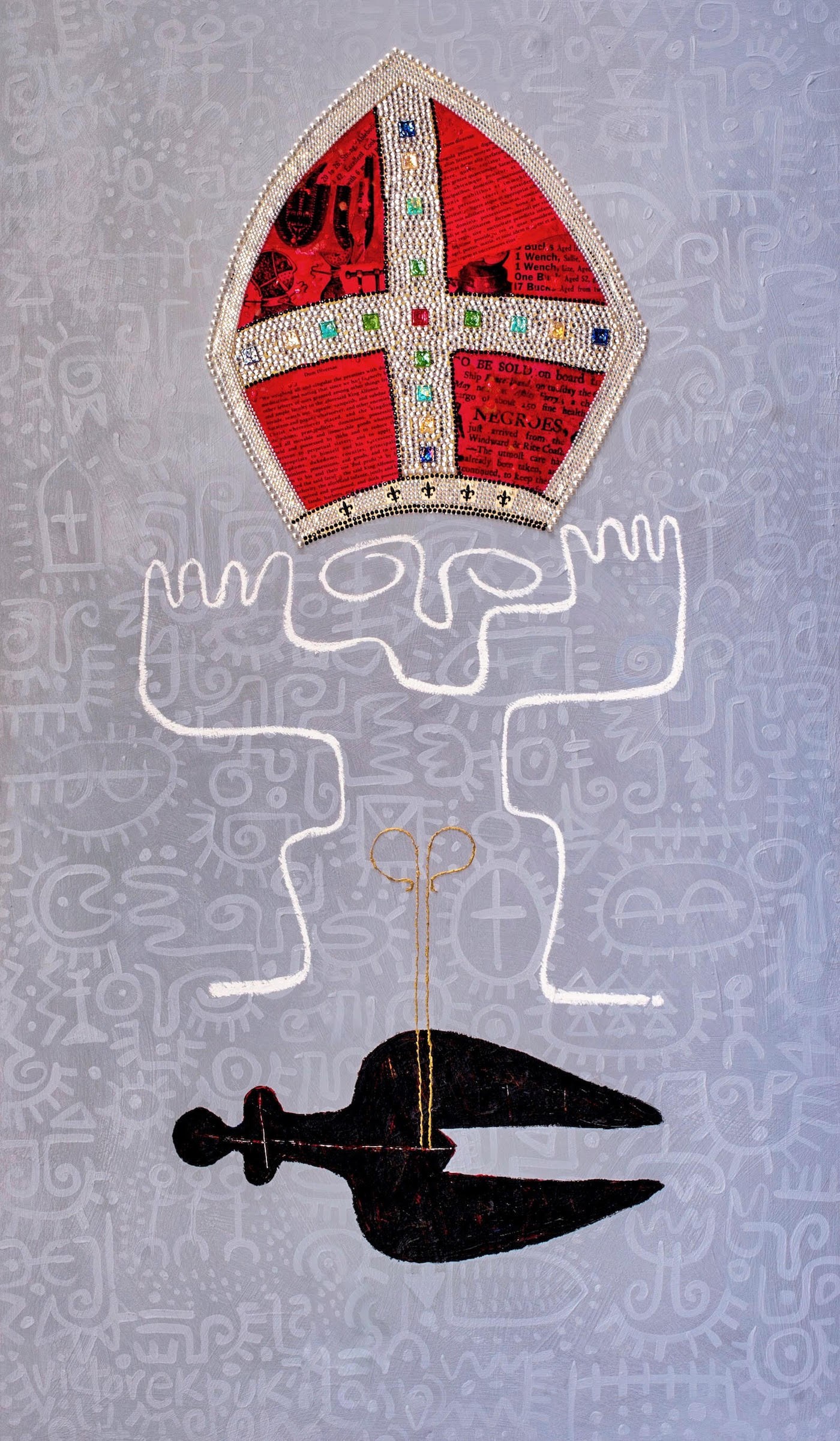 C&: The dominant imagery in the densely layered Union of Saint and Venus alludes to Giulio de' Medici (later Pope Clement VII) impregnating the enslaved Simonetta da Collevecchio and references the violation of "the Hottentot Venus." A hoary figure bearing a jeweled papal miter looms over a prostrate Black female body, a pair of croziers, a glided phallus penetrating her. When NMAAHC reopens, the painting will be on view in the wake of Wilton Gregory's elevation by Pope Francis to the first African American cardinal. What are your thoughts on this coincidental timing?