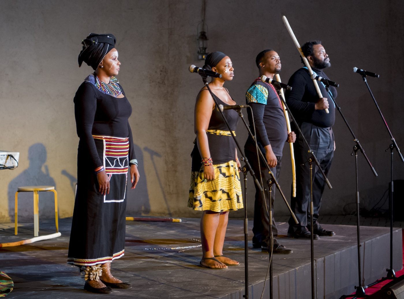 <figcaption> Tsohle – A revolting mass,performance by Neo Muyanga (composer and musician), Al Hamdan Bin Mousa Courtyard, Al Mureijah Square, 2018. Image courtesy of Sharjah Art Foundation.
