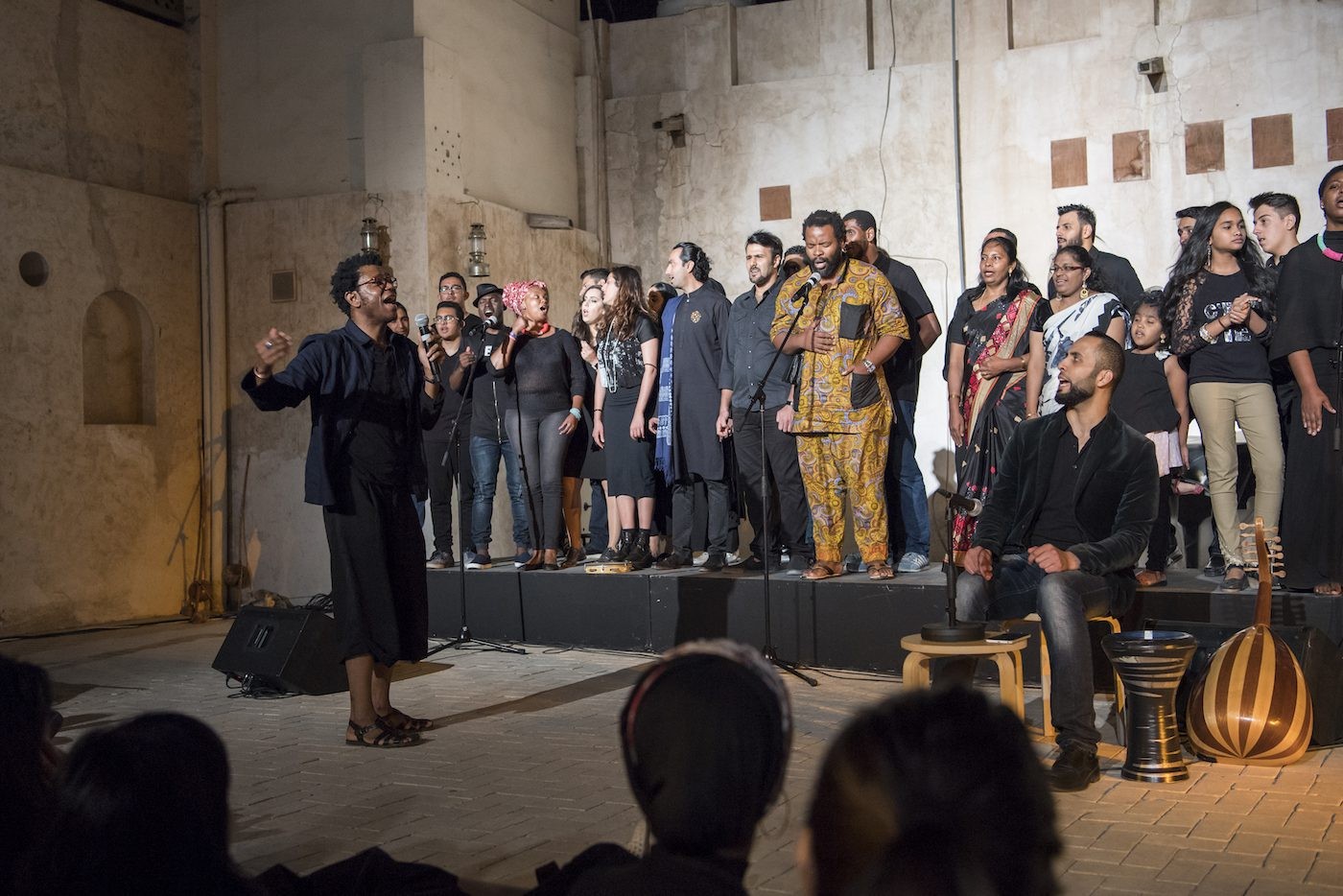 Beyond the talks, there were performances and poetic moments throughout the days. Wael Shawky reinterpreted the French poem about the Crusades, La Chanson de Roland, from an Arab perspective. The performance consisted of 20 fidjeri singers and musicians performing in the traditional style of Arabian Gulf pearl divers alongside selected passages from the text. Hajra Waheed drew parallels between legacies of colonial violence and her intimate family story through a performance of light and shadow. And Neo Muyanga presented a few of his collaborative works with local singers of all ages. For Naham the artist invited singers across the Emirates to form a choir for a performance of various resistance songs. These were also based on naham (pearl ship singers) historical tales of toil and struggle. While in Tsohle (meaning “all things” in Sesotho) the composer disrupts musical narratives of struggle with four singers performing South African church hymns and apartheid protest songs.