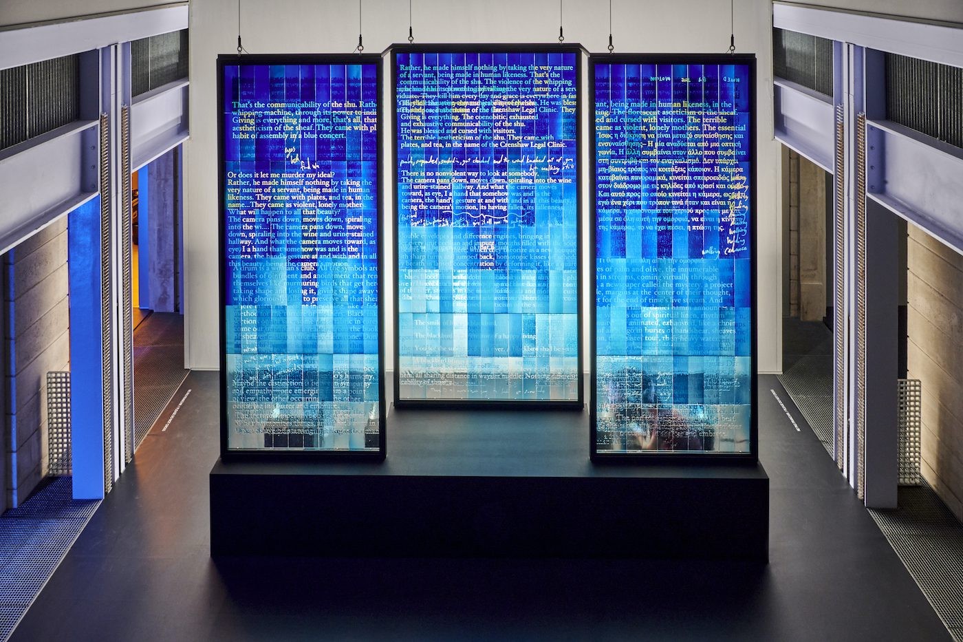 Wu Tsang, Sustained Glass (with Fred Moten, boychild, Lorenzo Moten, Hypatia Vourloumis, and Moved by the Motion), 2019. Installation view at Lafayette Anticipations, Paris.