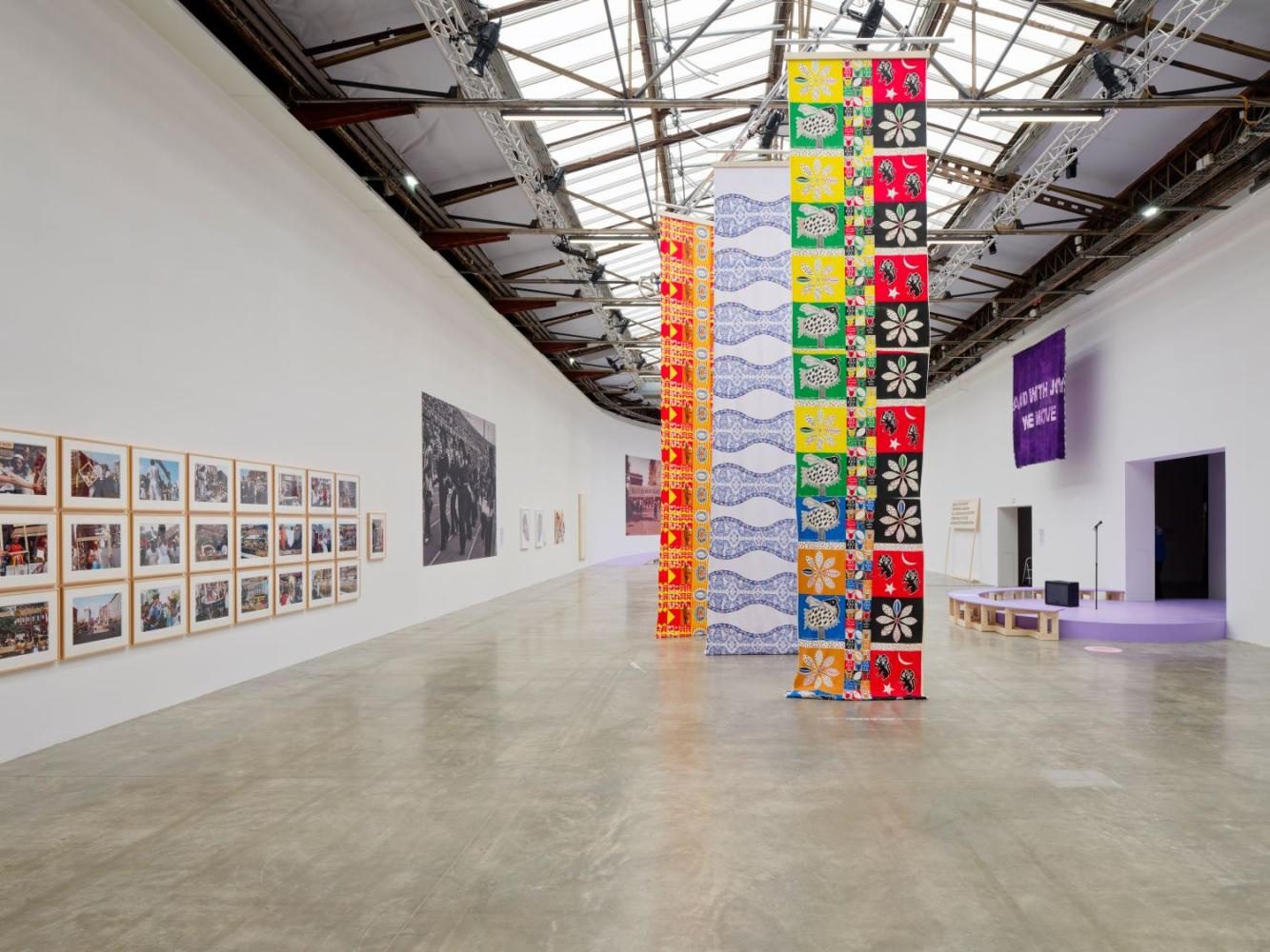 The generous space of Palais de Tokyo is an ideal setting for this exhibition, which underlines the need for marginalized people to insist on their right to public spaces. Its staging here is a powerful symbol, given that the majority of Parisian art institutions are still more or less hostile to people of color, especially children and teenagers who are familiar with racist incidents occurring during school visits to institutions. The exhibition makes room for the visitor to participate by embroidering, sticking, drawing, building, and dancing alongside the artworks. This aspect is reinforced by a public program that includes evening performances in the "salle des fêtes," a festive corner created in the middle of the exhibition to host poets, dancers, stand-up artists, and other performers, including the public. Bringing together artists from across generations and geographies, Joie Collective – Apprendre à Flamboyer shows us that in the gloomy times we're living through, collective joy promises a path toward liberation.