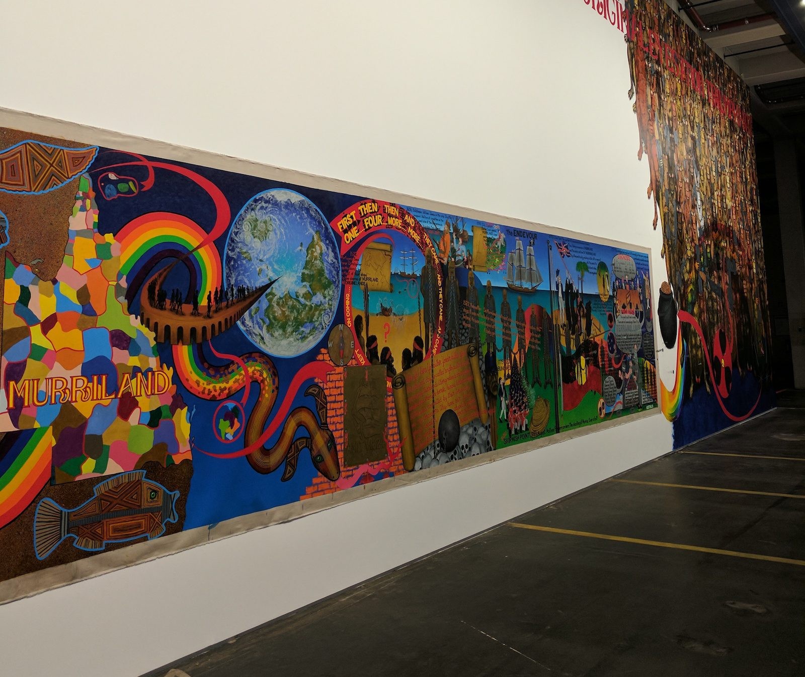 <figcaption> Gordon Hookey, MURRILAND!, 2017, Oil on linen and mural 2 × 10 m, mural dimensions variable. Neue Neue Galerie Kassel. Photo: C&.