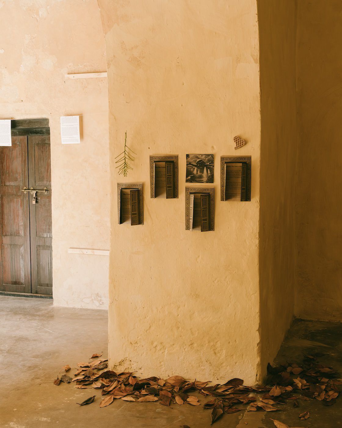 Installation view „Radio Mikoko+“, Doors to «Rooted», 2025. Prints on paper various objects (existing and speculative) text, by Ann Mbuti. Credits: Freddie Odede, 199xorg