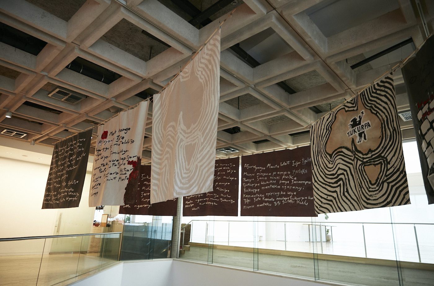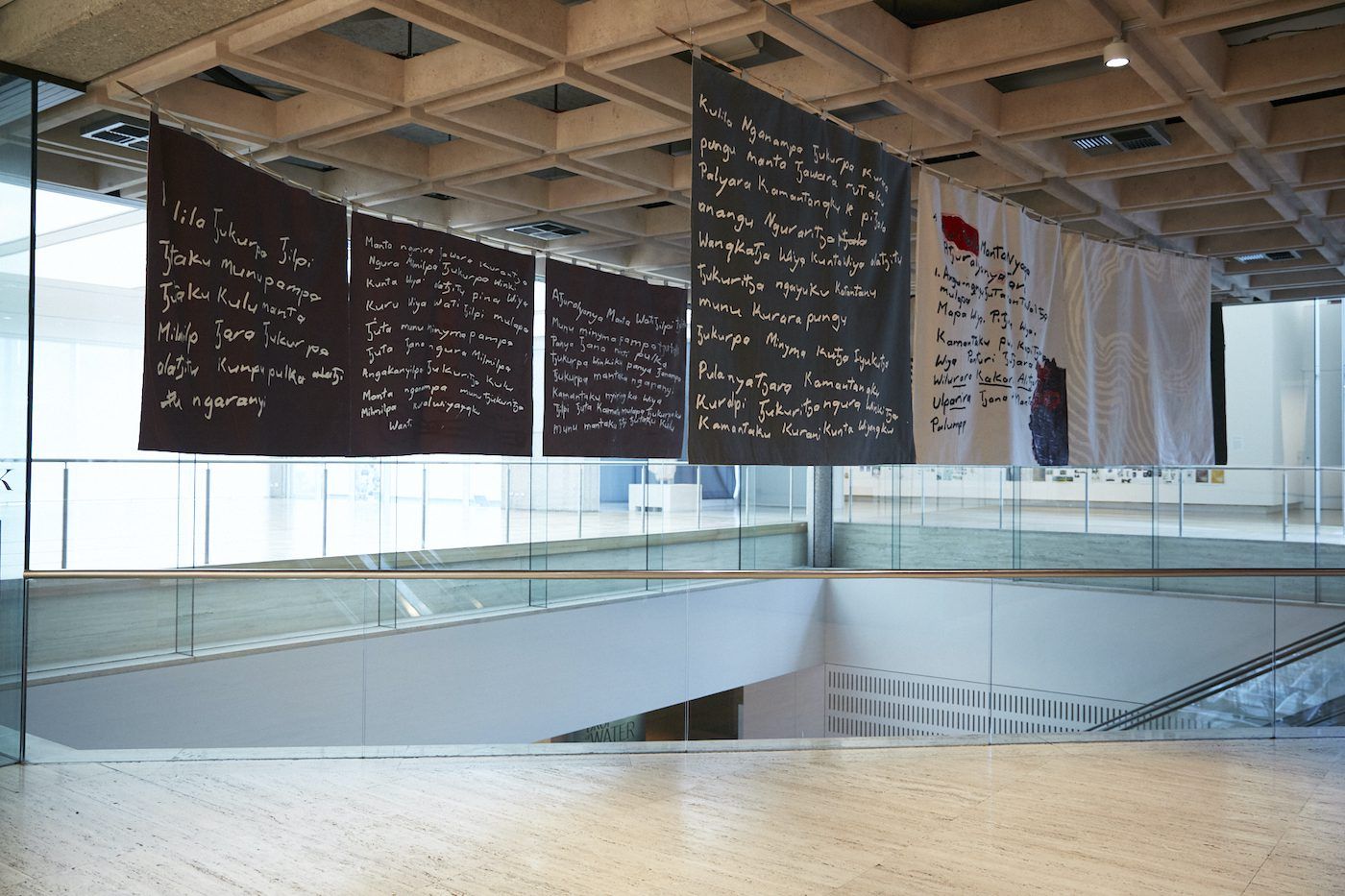 Kunmanara Mumu Mike Williams, Kulilaya munu nintiriwa (Listen and learn), 2020, installation of UV cured flat-bed prints on hand finished untreated canvas with alterations in paint, ink and tea; suspended from spears made by kulata (spearbush) and mulga, malu, pulyku (kangaroo tendon) and kiti (mulga leaf resin), dimensions variable. Installation view, detail (2020) for the 22nd Biennale of Sydney, Art Gallery of New South Wales. Courtesy Mimili Maku Arts. Photograph: Zan Wimberley