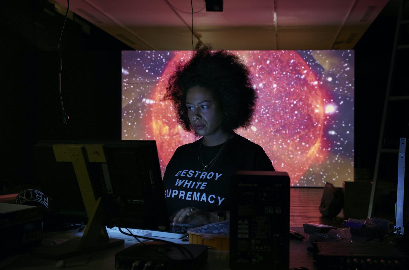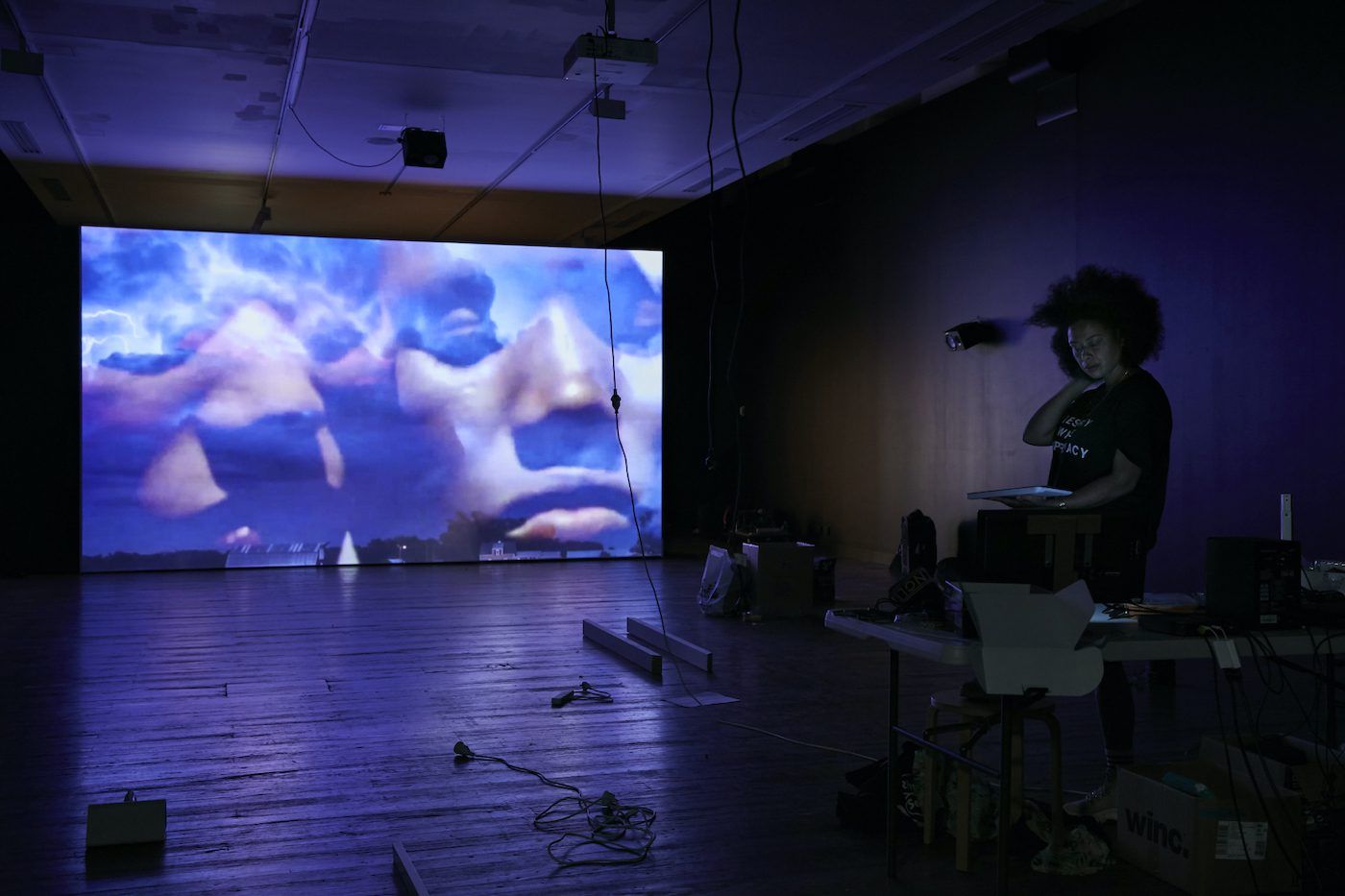 Hannah Catherine Jones installing Owed to Diaspora(s), Hannah Catherine Jones, 2020, mixed media installation, dimensions variable. Installation progress view (2020) for the 22nd Biennale of Sydney, National Art School. Courtesy the artist. Photograph: Zan Wimberley