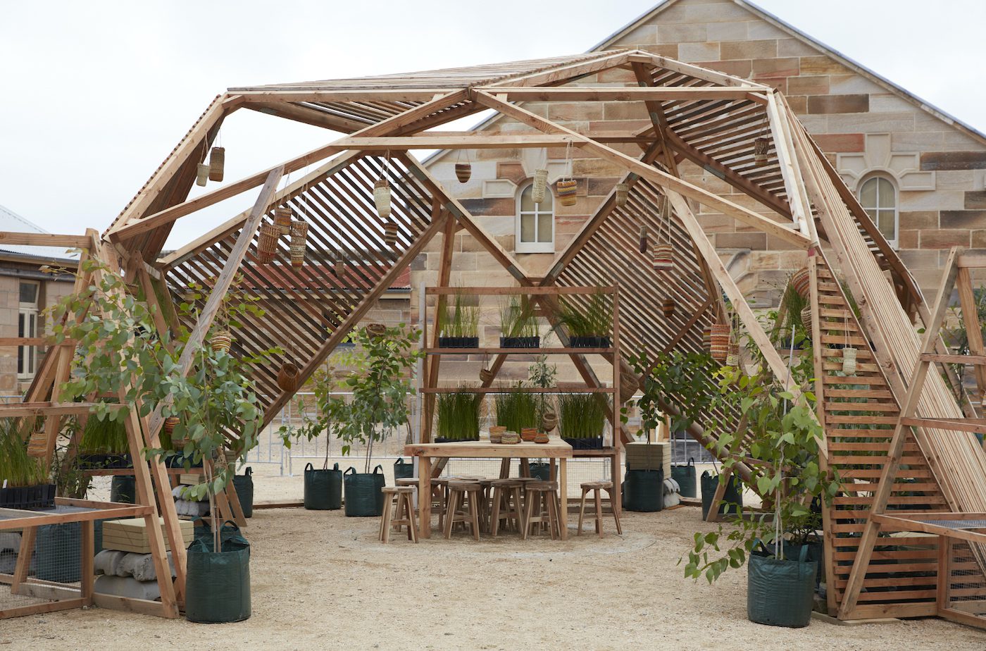 Tony Albert, Healing Land, Remembering Country, 2020, greenhouse nursery, hand woven baskets, native plants. Installation view (2020) for the 22nd Biennale of Sydney, Cockatoo Island. Courtesy the artist and Sullivan+Strumpf, Sydney. Photograph: Zan Wimberley