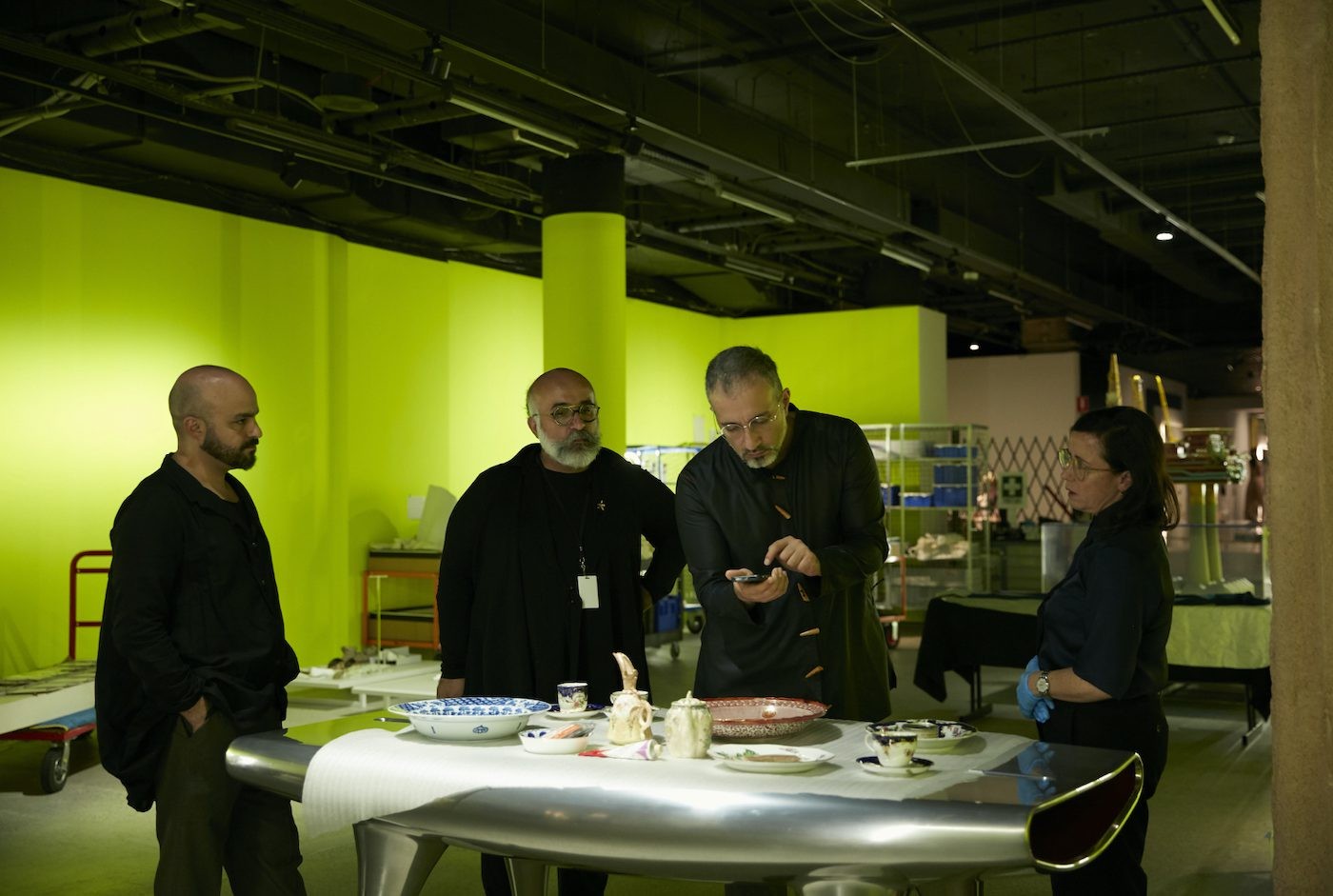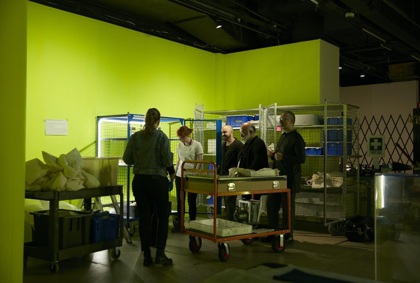 Ramin Haerizadeh, Rokni Haerizadeh and Hesam Rahmanian installing I Prefer Talking to Doctors, About Something Else. Ramin Haerizadeh, Rokni Haerizadeh and Hesam Rahmanian, 2020. Installation progress view (2020) for the 22nd Biennale of Sydney, Powerhouse Museum (MAAS). Photograph: Zan Wimberley.