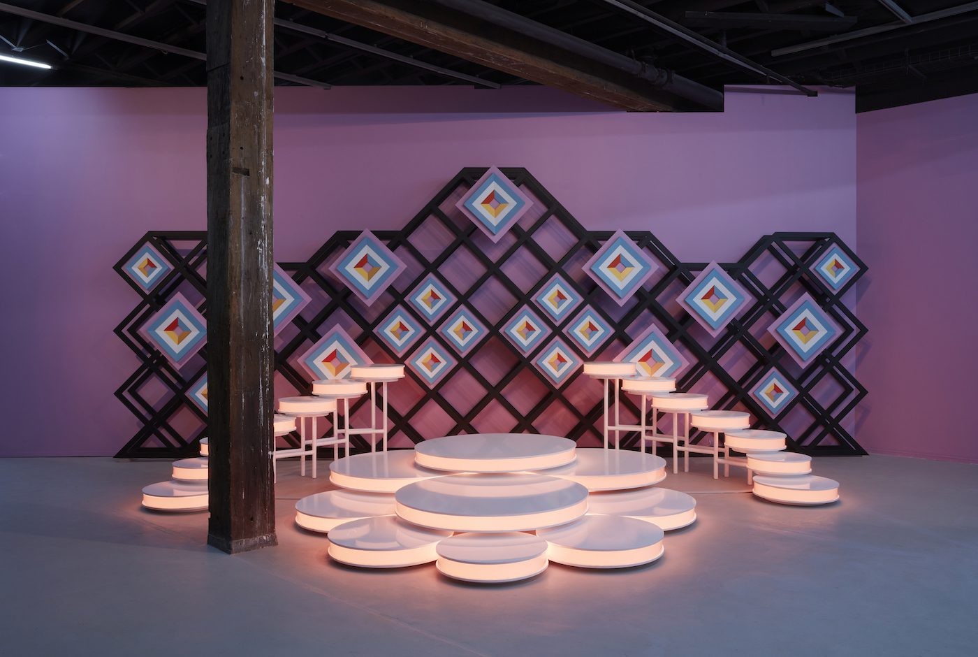 Fátima Rodrigo Gonzales, Sabado Gigante (Gigantic Saturday), 2020, MDF, steel, acrylic sheet, enamel paint, LED. Installation view (2020) for the 22nd Biennale of Sydney, Artspace. Courtesy the artist and 80m2 Livia Benavides Gallery, Lima. Photograph: Zan Wimberley