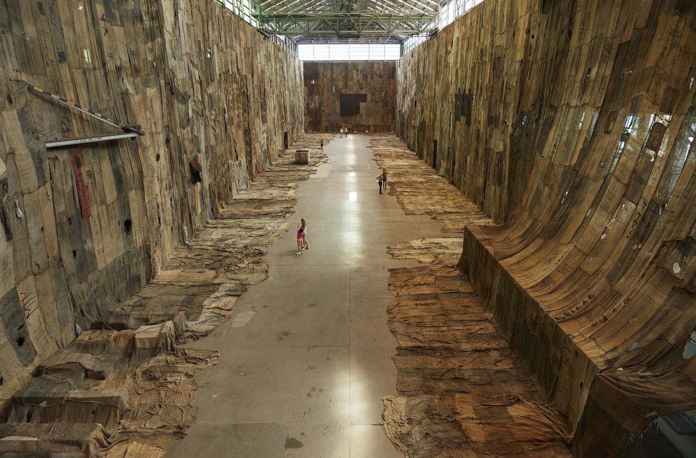 Ibrahim Mahama, A Grain of Wheat, 2015-18, mixed media. Installation view (2020) for the 22nd Biennale of Sydney, Artspace. Courtesy the artist and White Cube, London / Hong Kong. Photograph: Zan Wimberley