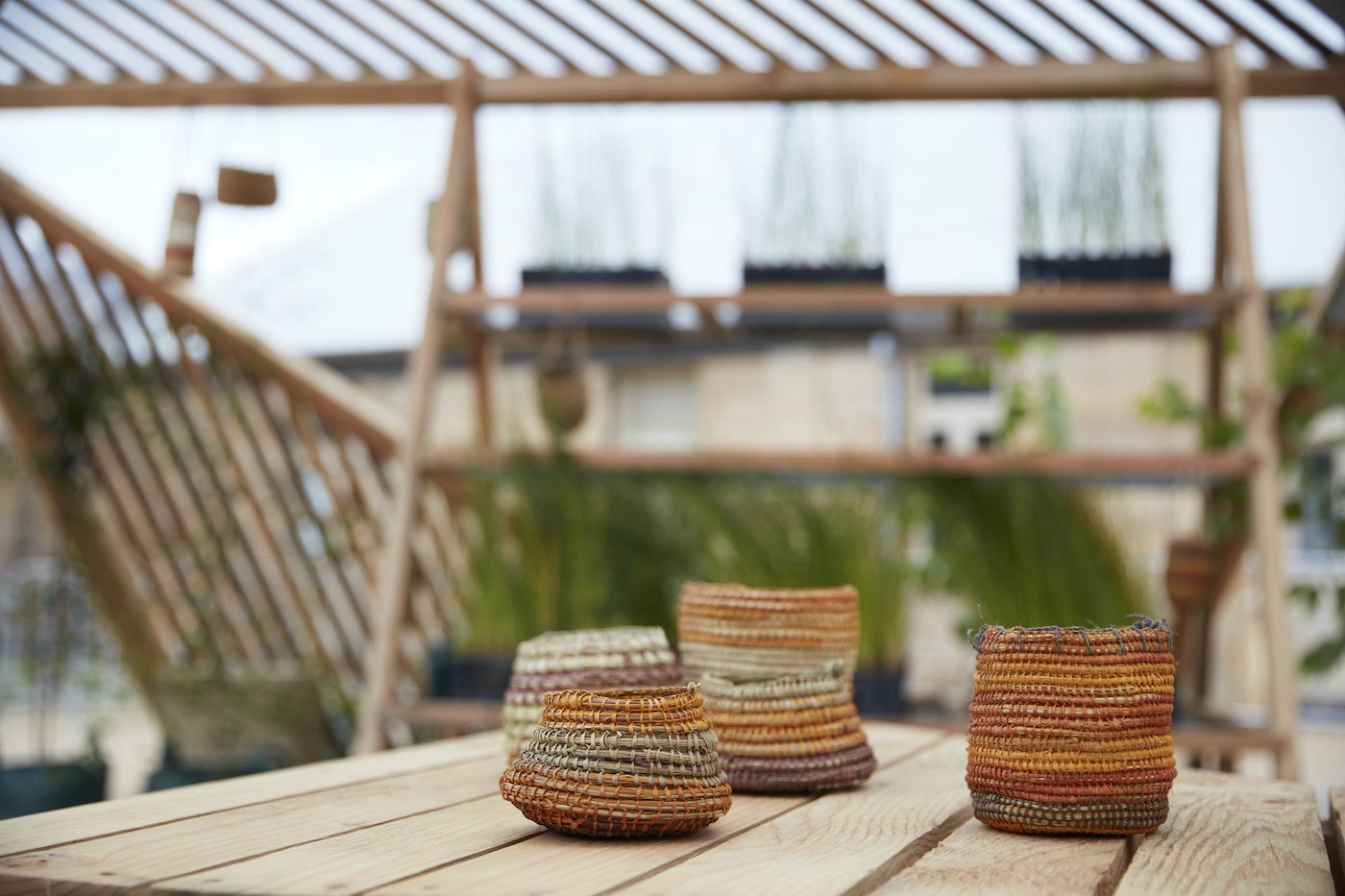 Tony Albert, Healing Land, Remembering Country, 2020, greenhouse nursery, hand woven baskets, native plants. Installation view, detail (2020) for the 22nd Biennale of Sydney, Cockatoo Island. Courtesy the artist and Sullivan+Strumpf, Sydney. Photograph: Zan Wimberley