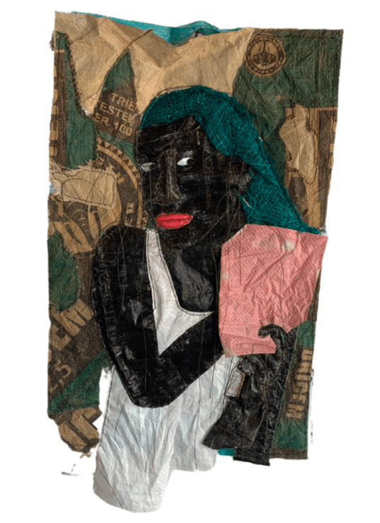 Wilfred Timire’s works similarly reference his lived experience. Timire’s tapestries are created from found packaging, the very stuff of Harare’s streets. In Lover’s Call, the red, blue, and white tartan of plastic-weave “China bags” is immediately recognizable and speaks of cross-border trade, migrant labor, and Diaspora. A number of artists, including Nobukho Nqaba and Dan Halter, explore the symbolism of this type of bag. Timire crafted the bag’s zipper section into a jacket worn by a young man talking on his mobile phone to his lover.