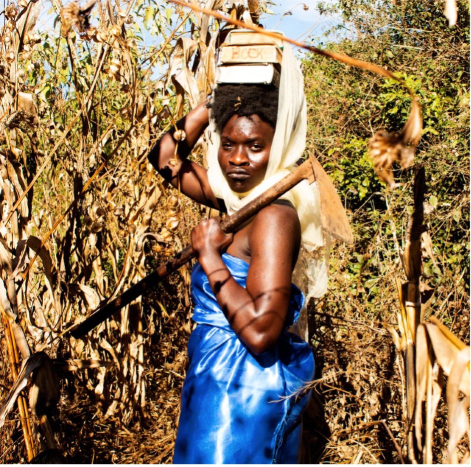 The symbolic language of hoe, book, and maize reoccur in an untitled work by Chiwanga portraying a more demure subject looking over her shoulder. Chiwanga’s sophisticated lighting and styling reminds me of the promiscuous nature of contemporary photographic practice: fine art overlaps with fashion, which in turn borrows from gallery walls.
