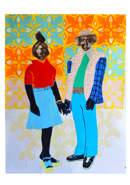 Franklyn Dzingai’s rich mixed-media works Afternoon Photoshoot and Photoshoot with Uncle make overt reference to the photographic medium and to the ritual of documenting family gatherings and relationships. Dzingai’s collages of magazine images, flat blocks of color, textile prints, and painted details are timeless scenes of everyday life.