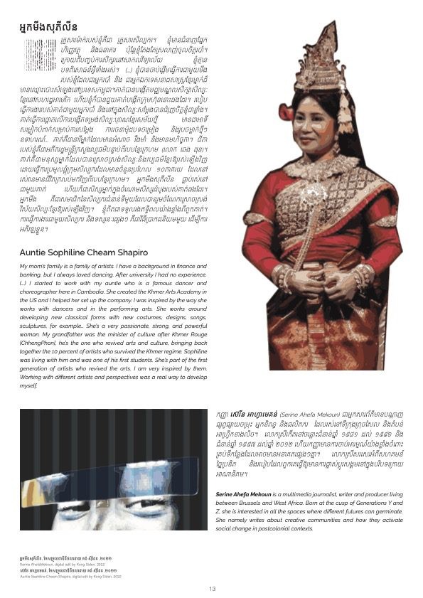 De nouvelles connexions animent également Serine Ahefa Mekoun. Basée en Belgique et au Togo développant une pratique qui se situe entre l’Europe et l’Afrique de l’Ouest, elle s’intéresse aux stratégies de survie adoptées par les scènes artistiques émergentes. Pour elle, la langue joue un rôle essentiel dans la survie, exprimant le rapport à une culture dominante directrice qui exige automatiquement un positionnement. Serine a visité Sa Sa Art Projects à Phnom Penh, la capitale du Cambodge, et a invité les membres du collectif à participer à une séance de narration. Le lieu géré par des artistes existe depuis 2010 et se consacre aux pratiques expérimentales et critiques de l’art contemporain. Une insuffisance de l’enseignement de l’art actuel et de son engagement les a motivés à ouvrir un espace de discussion critique. Et bien que Sa Sa existe depuis plus de dix ans, ses membres ont appris à mieux se connaître en partageant leurs histoires. Les termes et idées essentiels de ces moments de partage cohabitent désormais dans un glossaire que Serine a compilé. Il donne un aperçu verbal de ce projet dynamique, expérimental et témoigne de la portée imaginative d’anecdotes apparemment aléatoires.