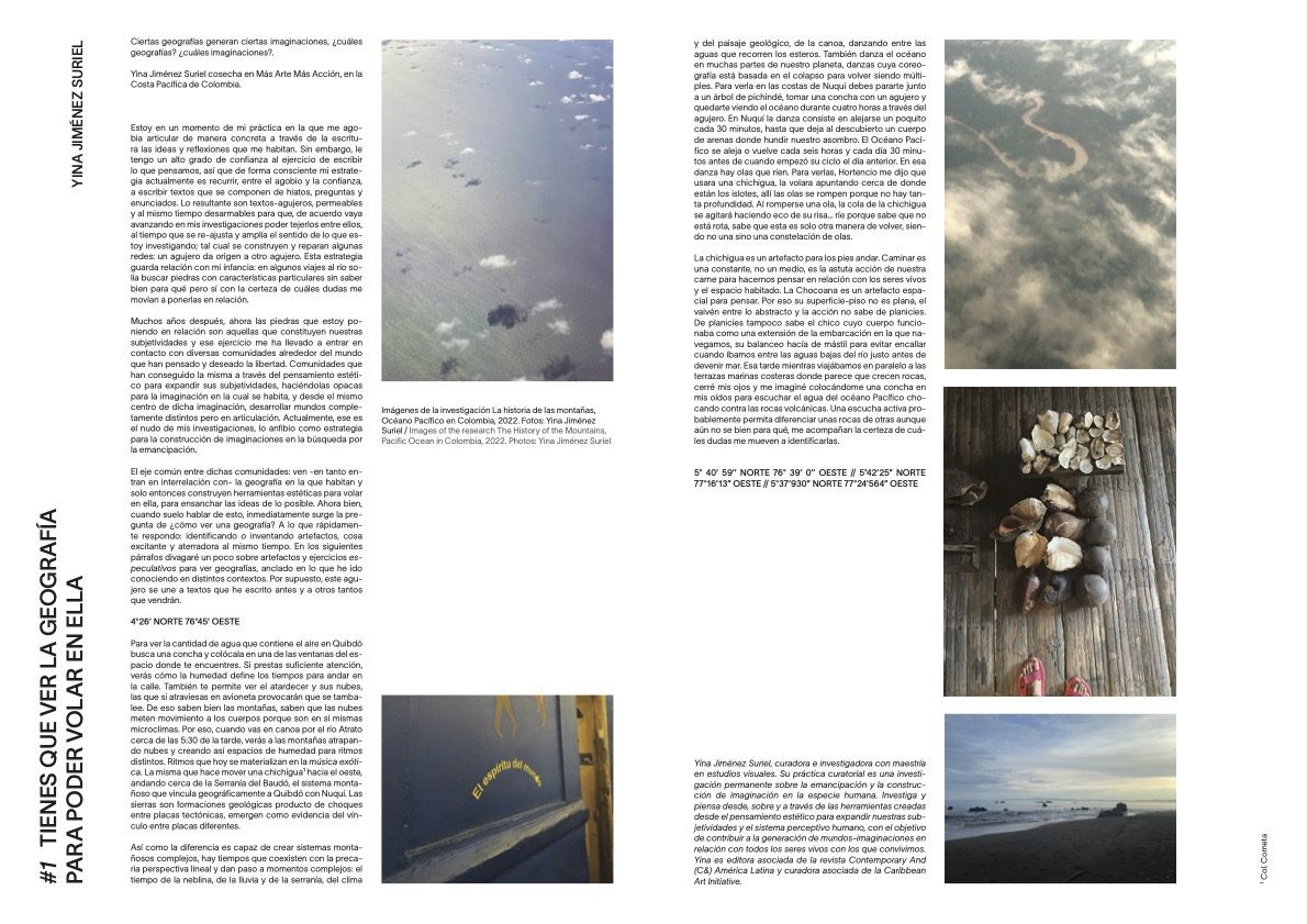 Le voyage de Yina Jimenez Suriel, quant à lui, était axé sur la géographie. La curatrice et la chercheuse de la République dominicaine a rencontré le collectif colombien derrière Más Arte Más Acción à Bogotá, à un moment charnière de sa pratique. La fondation culturelle à but non lucratif développe une pensée critique à travers l’art et, après plus de dix ans d’existence, a entrepris de repenser la manière dont cela pourrait se traduire dans son travail lorsqu’elle a accepté l’invitation à participer à la quinzième édition de la documenta. Les méthodes de Yina alimentent toujours les processus des artistes et des organisations avec lesquels elle travaille. Ainsi, dans le cadre de sa recherche avec MaMa, elle a inclus les différentes communautés avec lesquelles le collectif avait déjà travaillé. « J’ai réfléchi au microclimat et aux différentes géographies pour choisir mes destinations » explique Yina. En plus de Bogotá, elle a visité au total quatre régions de Colombie. Yina s’est vite rendu compte que, malgré l’énorme distance géographique qui les séparait, les membres de MaMa se posaient les mêmes questions qu’elle. Bien que leurs orientations soient différentes, leurs intérêts partageaient le même langage.