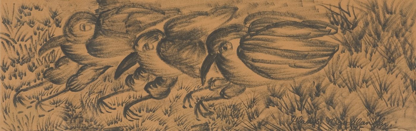 <figcaption> Gladys Mgudlandlu, Study of Birds, 1965. Ink on brown paper. Courtesy Johannesburg Art Gallery