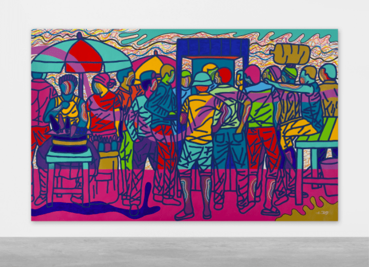 <figcaption> Ajarb Ategwa, Game Boys #1, 2018, Acrylic on canvas, 234x360cm. Courtesy the artist.