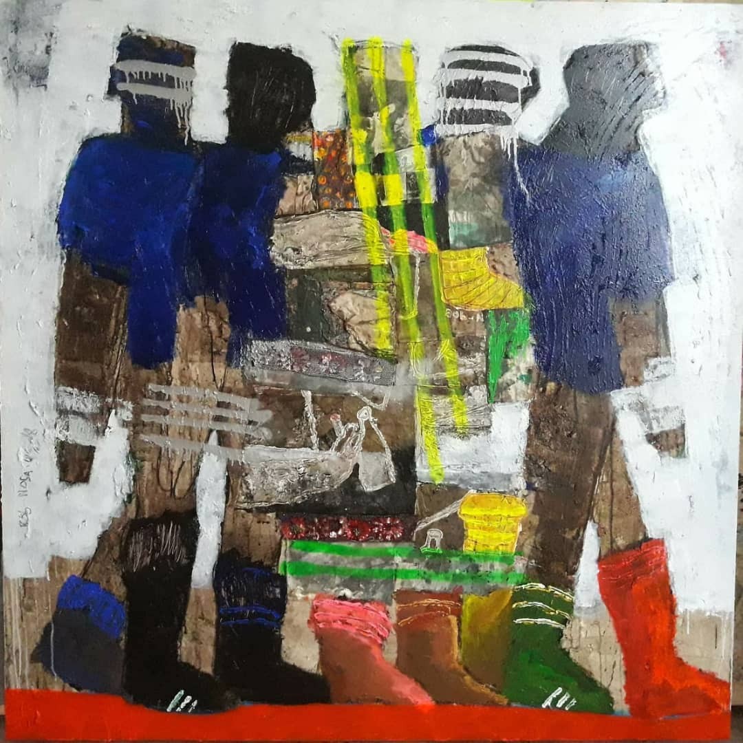 Bob-Nosa Uwagboe, The Mourners, 2019, 153cm x 153cm. Acrylic, Spray paint on textured Canvas. Photo: Dolapo Ogunnusi