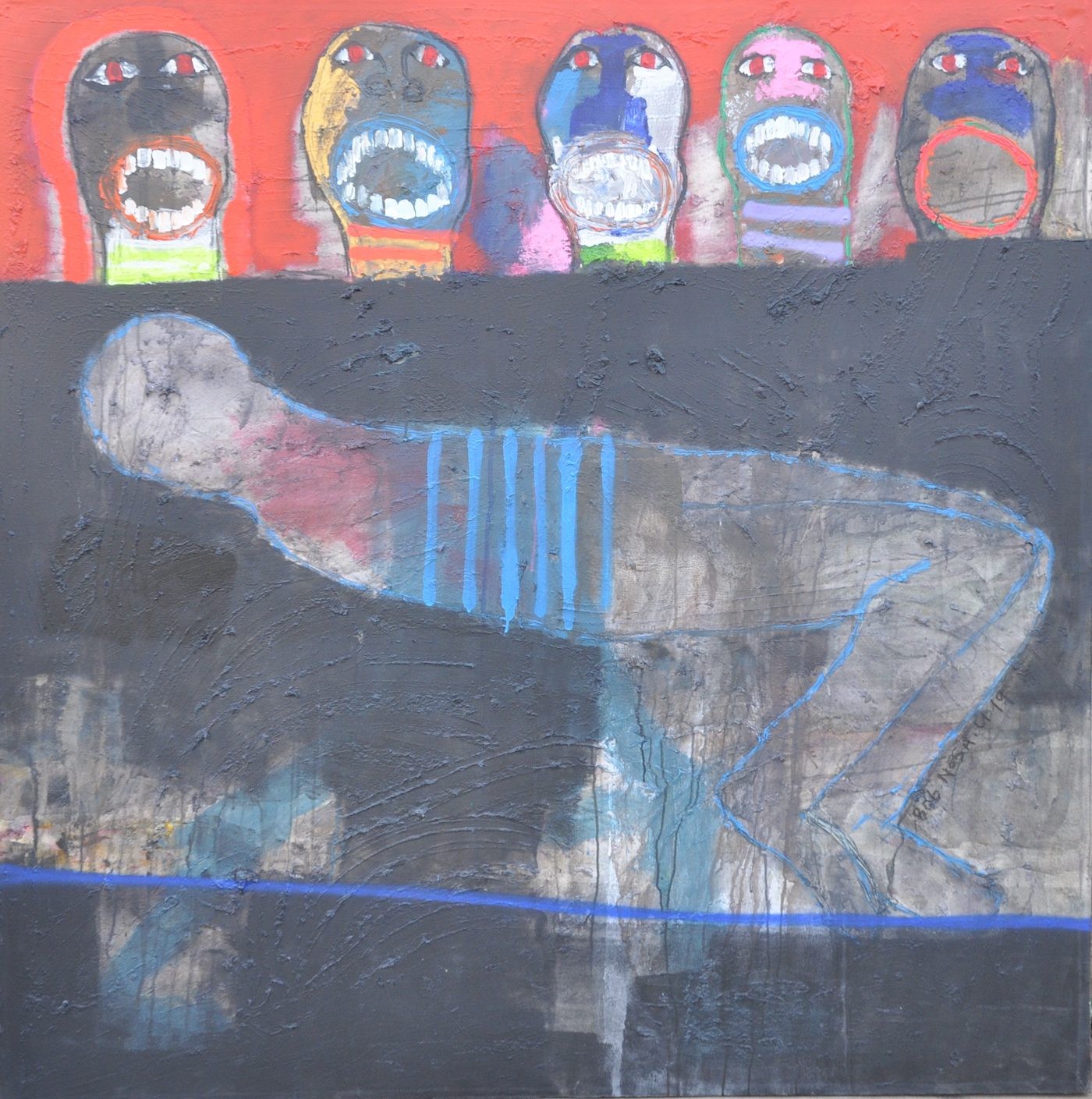 Uwagboe’s paintings are often peopled with ghoulish images that seem to linger on the threshold between life and death. These brutal anthropomorphic images are the expressions of his angst, while his palette of dark, shadowy, and raw colors reinforces his messages. A prominent device in Uwagboe’s work is nakedness. He uses nudity to symbolically portray the beastly nature of some humans in power, as well as the extreme deprivation and dispossession that the masses are forced to endure. Among some Nigerian cultures nakedness is an extreme protest tool, resorted to when other attempts fail. Yet the metaphor of nakedness is conceptually stretched so that decaying flesh reveals parts of the skeletons of Uwagboe’s forms. The artist also references death and the decay of corruption by using titles such as The Mourners, Rest in Peace, Legless Leader, Dying in Power, and Obituary (this latter being the title of his second solo exhibition, held in 2018). The resulting paintings are very powerful.