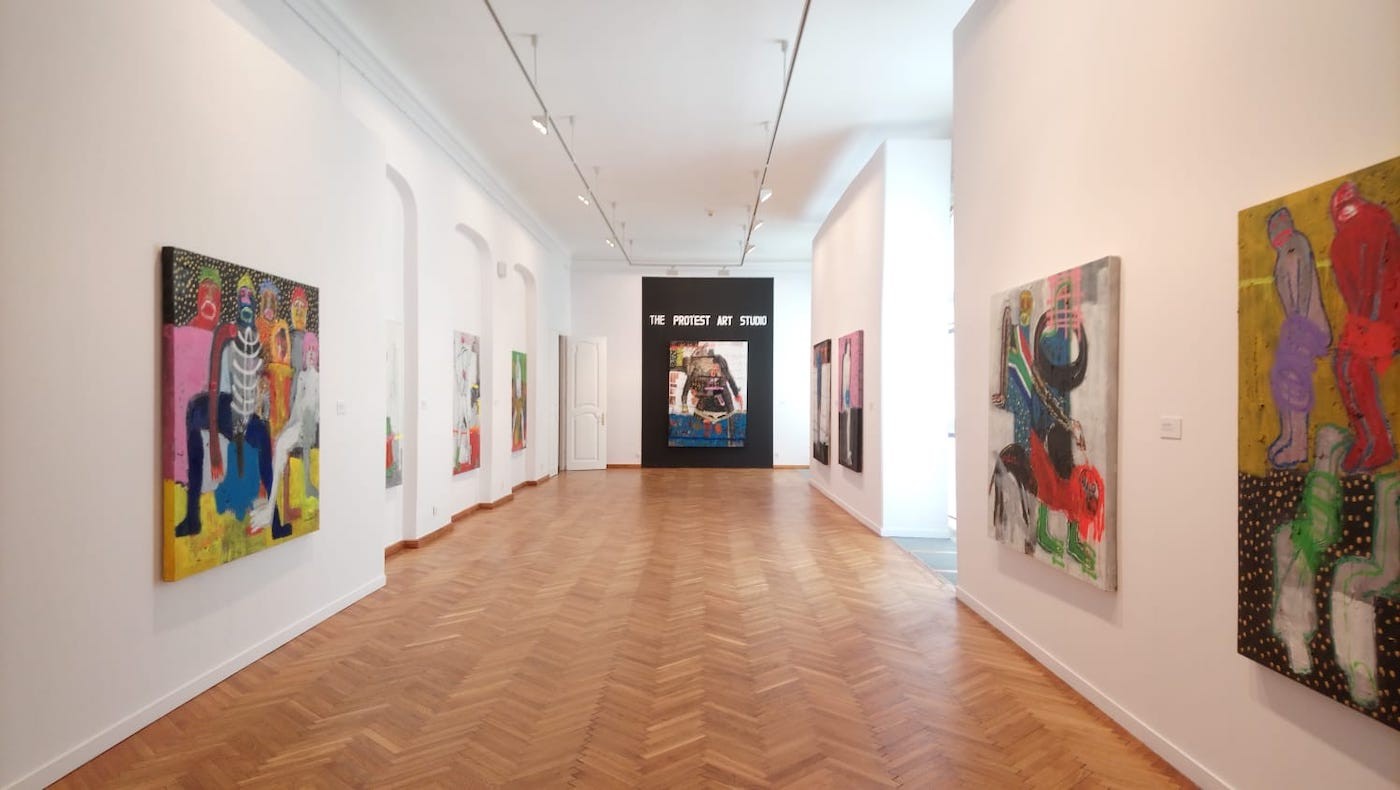 “The Protest Art Studio”, Installation view of Bob-Nosa Uwagboe’s solo exhibition Transit at the National Museum in Gdansk, 2020.