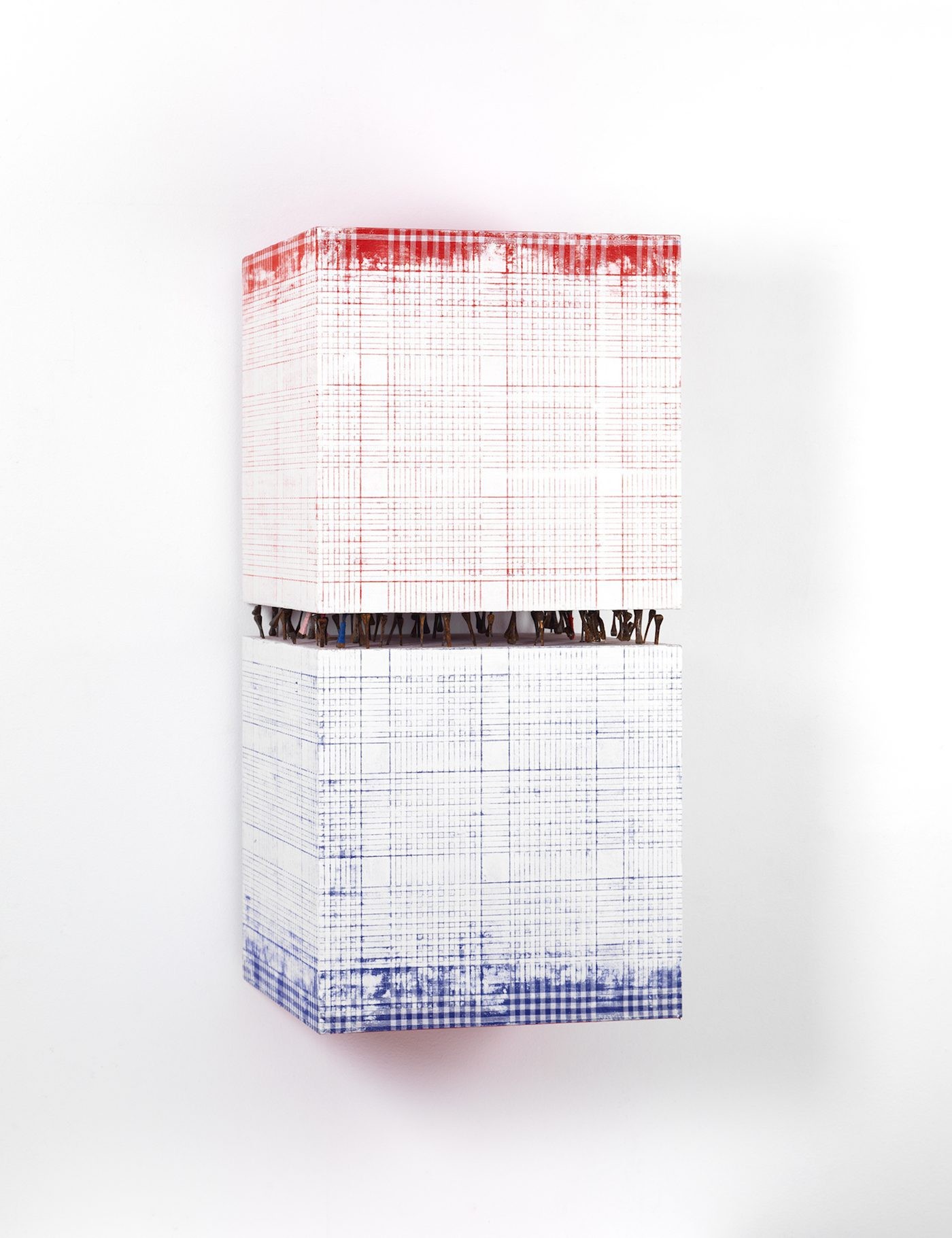 Remy Jungerman, NKISI PAKAMUTU, 2916. Cotton textile, MDF wood, nails, yarn, kaolin 15,7 x 16,5 x 33,5 inch (40 x 42 x 85 cm) photo© Aatjan renders. Courtesy the artist.(Nkisi are spirits, or an object that a spirit inhabits. It is frequently applied to a variety of objects used throughout the Congo Basin in Central Africa that are believed to contain spiritual powers or spirits. The term and its concept have passed with the Atlantic slave trade to the Americas.Pakamutu is a tern used for cleansing ritual in the forrest by the Surinamese Maroons)