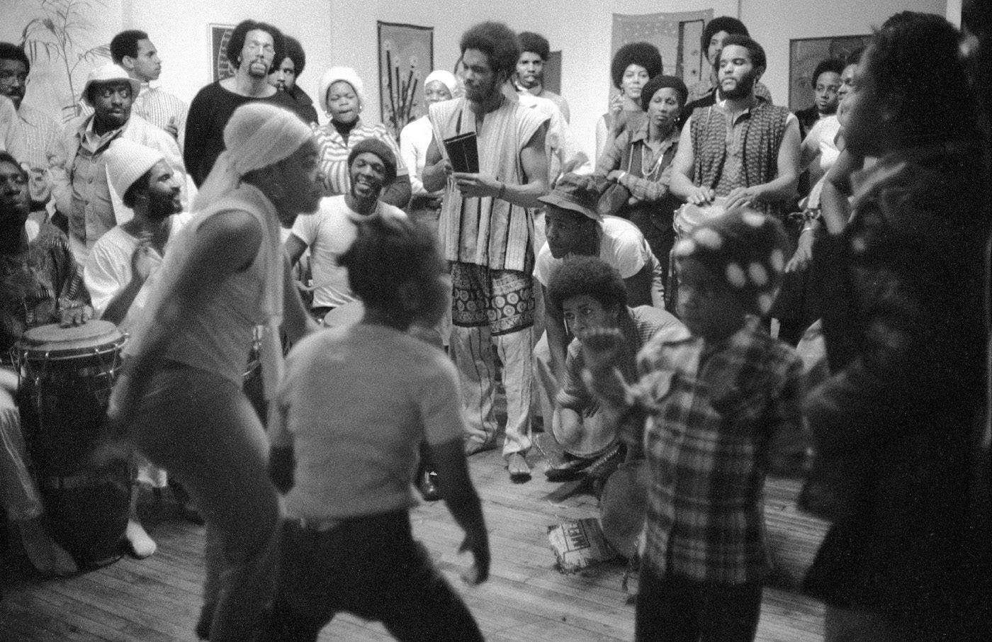 Dawoud Bey playing with drummers and dancers at the Studio Museum in Harlem, 1977. Photograph by Marilyn Nance