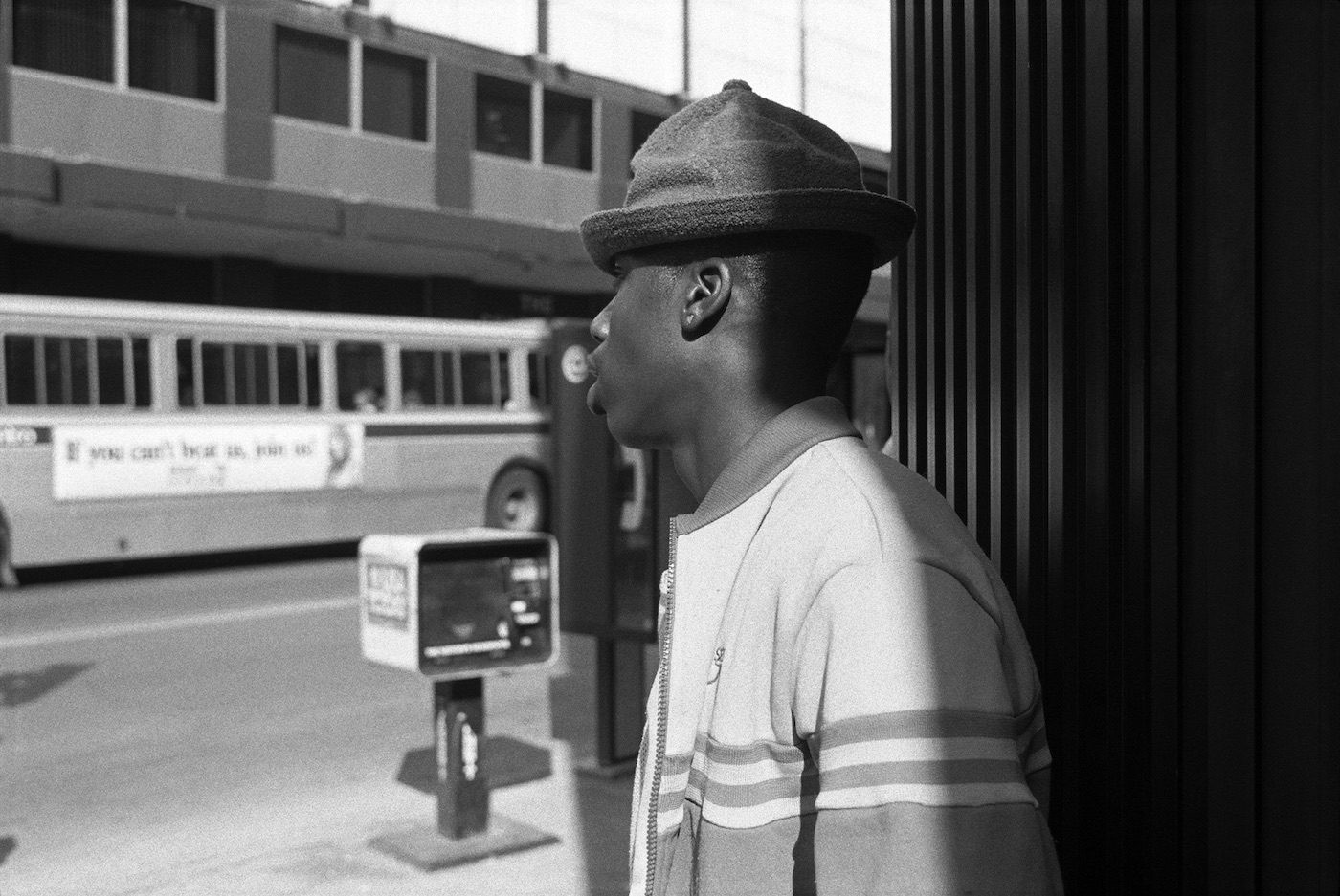 A Young Man at the Bus Stop, Syracuse, NY, 1985. Photograph by Dawoud Bey