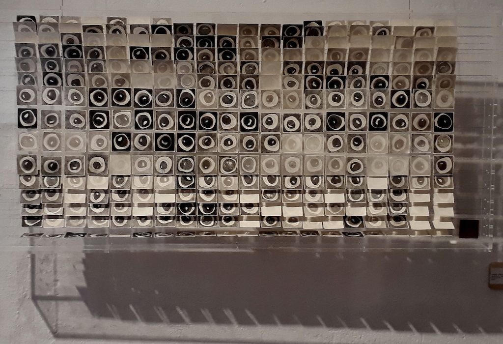 This piece composed of geometrical volumes of stainless steel is partially covered by dozens of small etchings containing images of the bull’s eyes printed in blue, gray, black and green tones. On the upper level, among other works, the fine art print Cogito/contemplo/medito (2017) is exhibited, in which the bull’s eyes are at once inside and outside of the three heads. This functioning at once of being inside and outside suggests a state of non-differentiation between thinking, seeing and meditating.